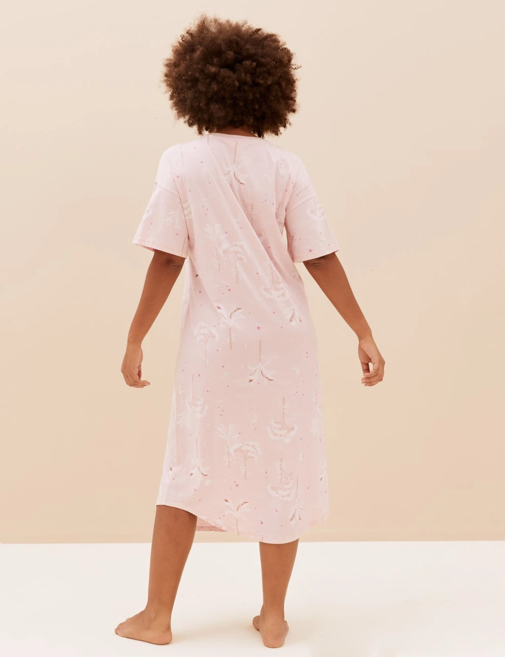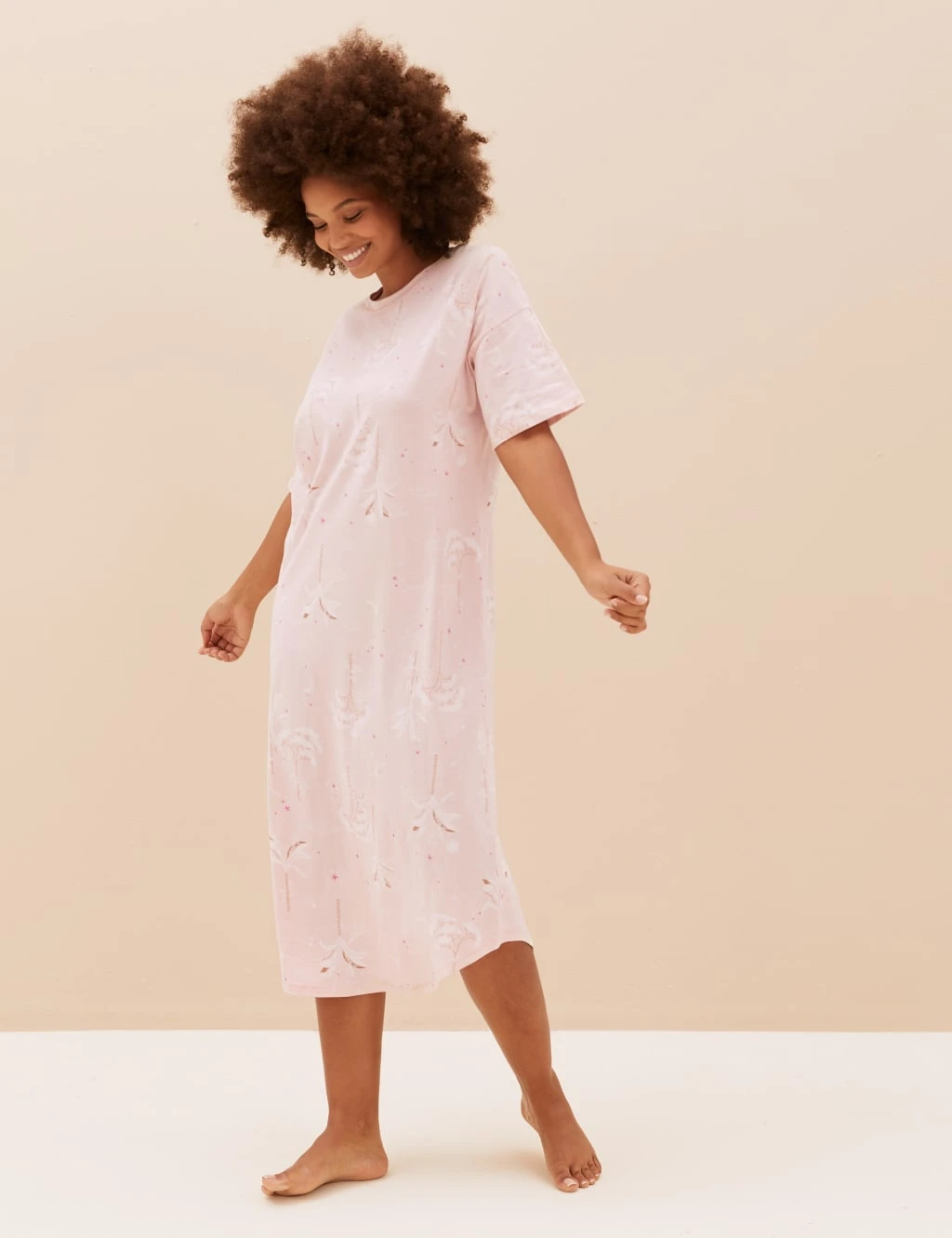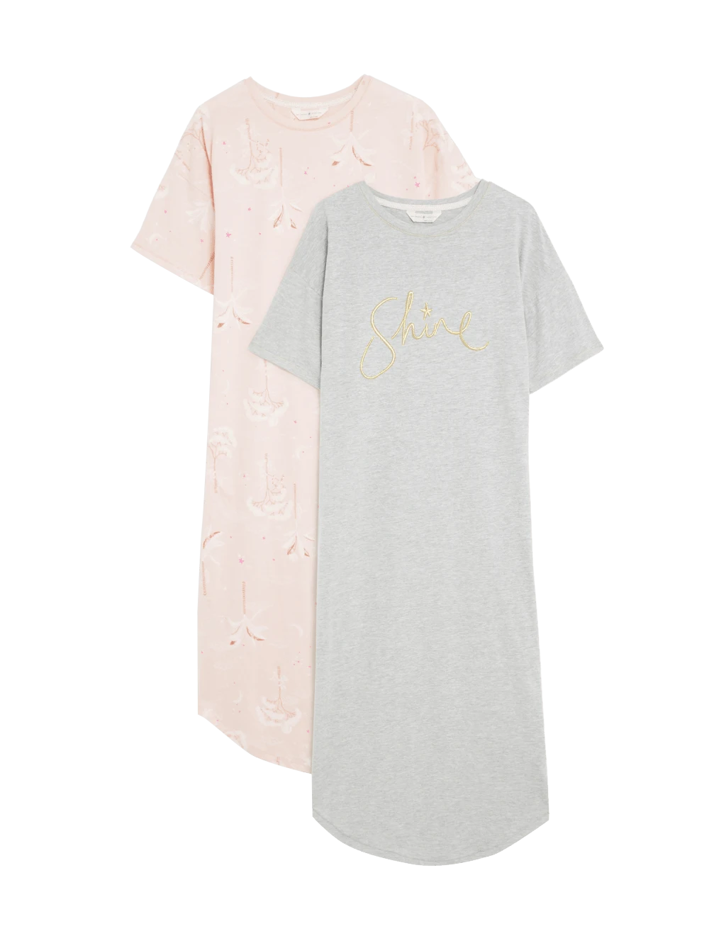 These cotton-rich nighties will have you sleeping in both comfort and style. Two-pack, each cut to a regular fit with a long length and short sleeves to help keep you cool. One has a delicate floral print, while the other is embroidered with a fun ‘Shine’ slogan.
