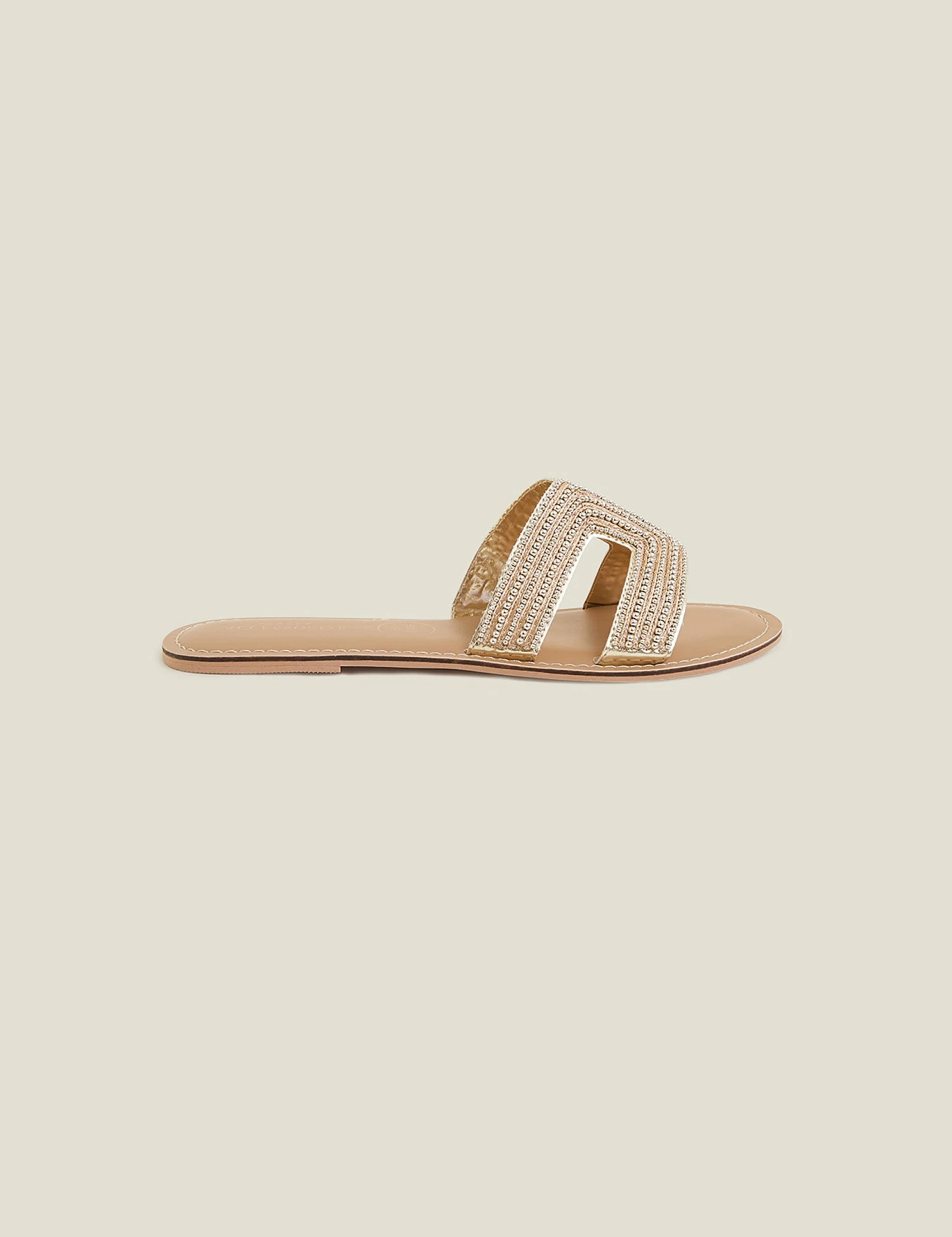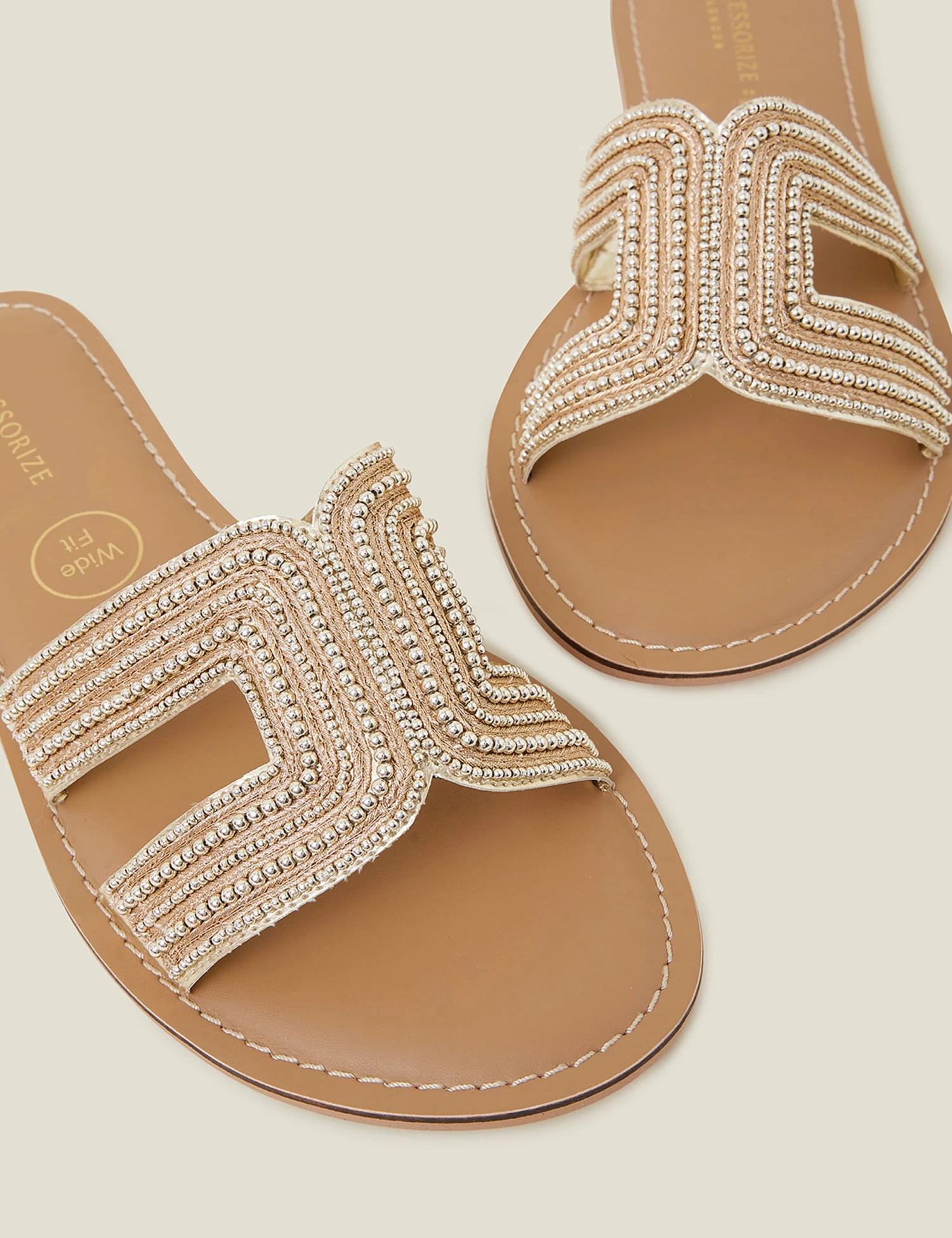 Bring a touch of glamour to your warm-weather ensembles with these sandals by Accessorize. The slip-on style has a wide fit for comfort. Metallic thread and gold-tone beads lend a sparkling effect.