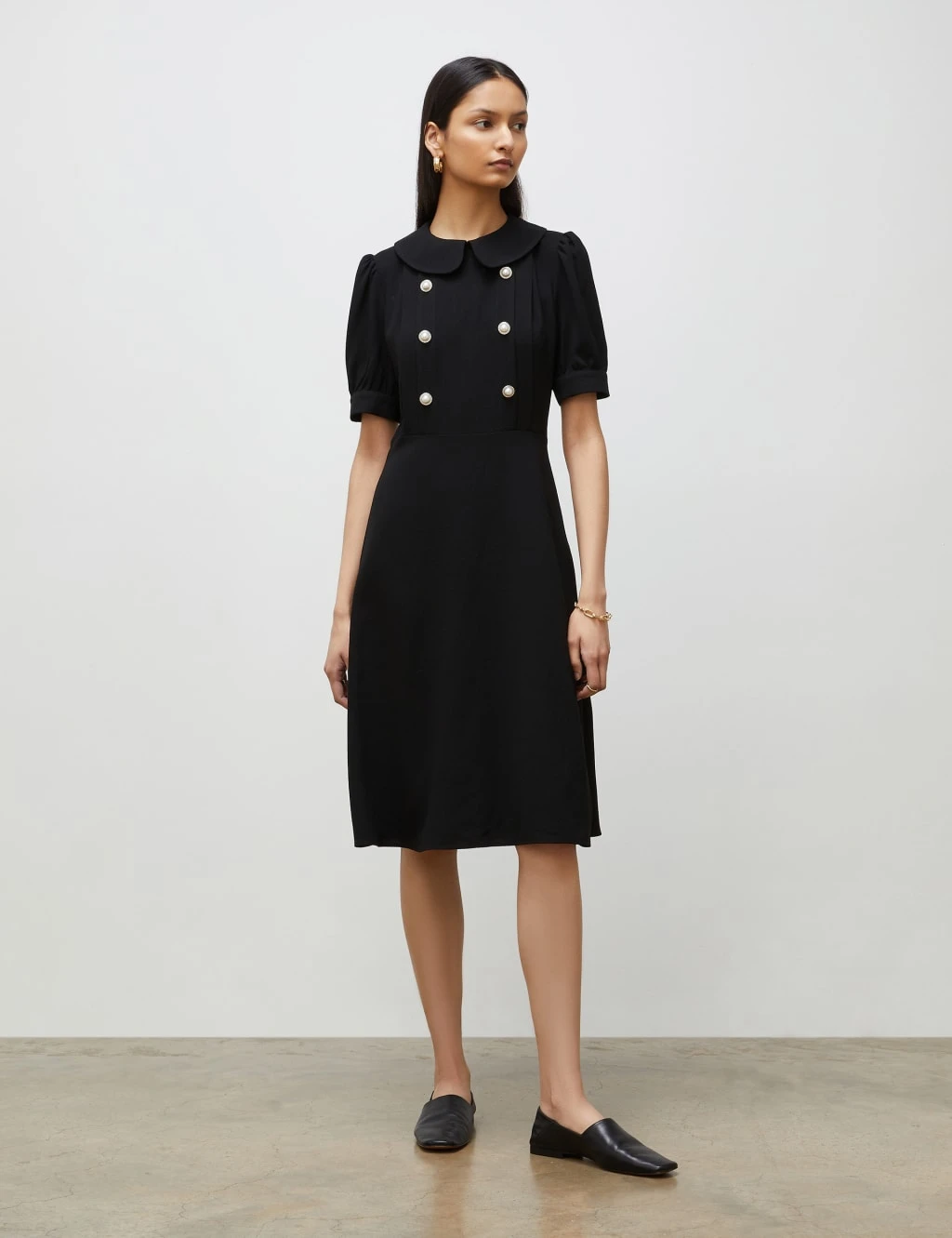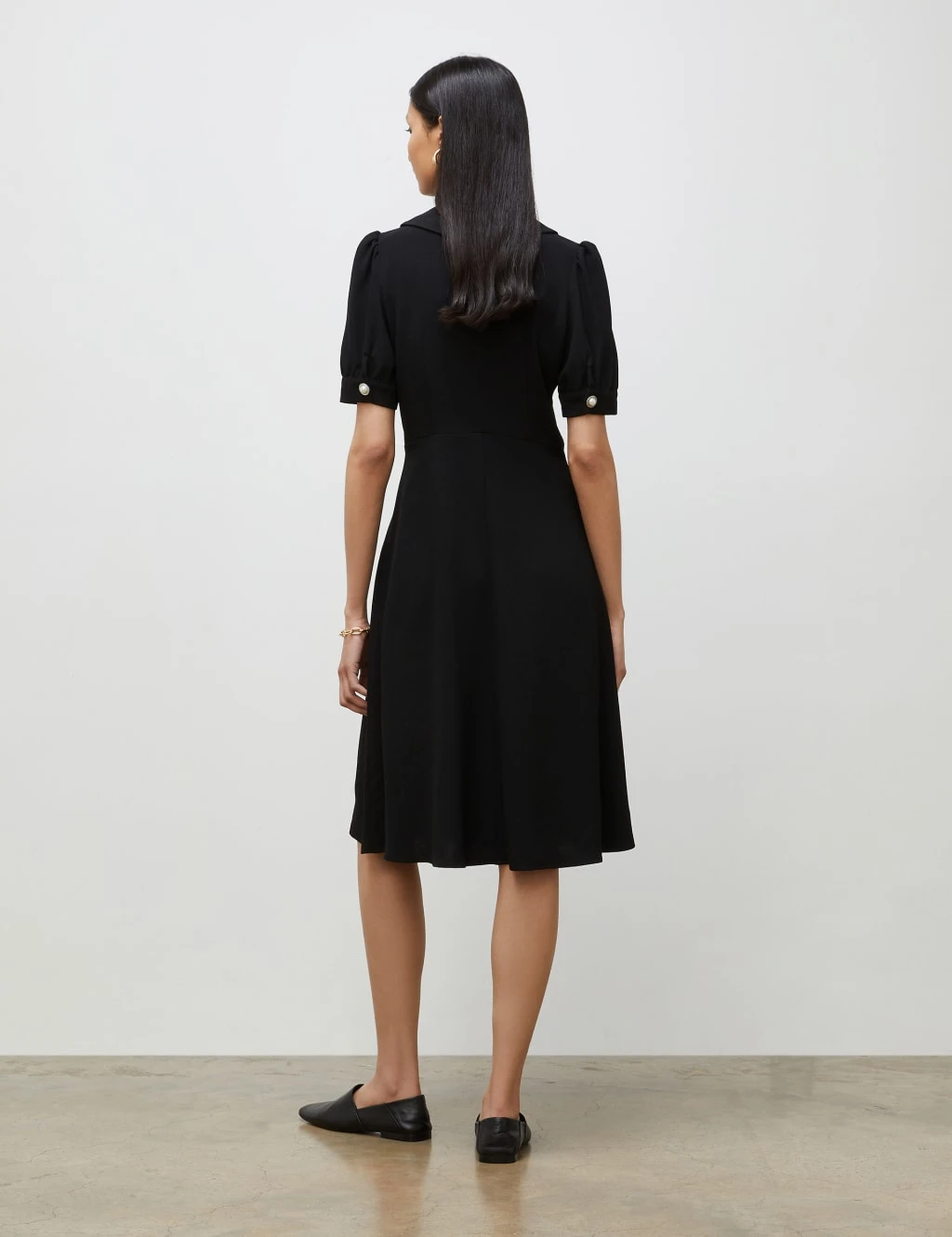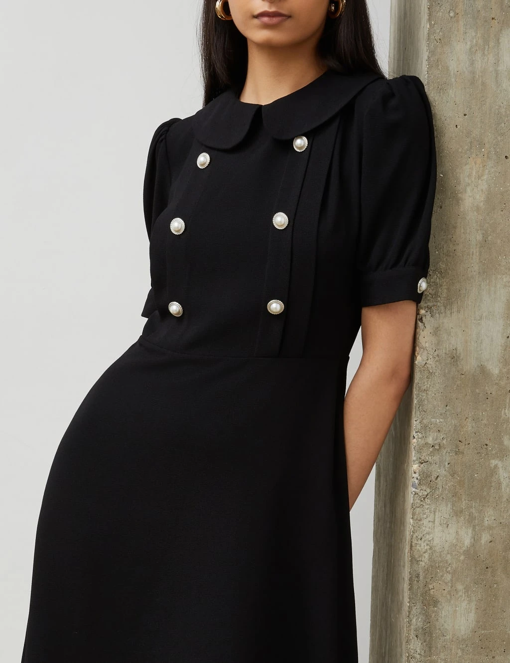 With twin rows of decorative buttons on the bodice, this waisted dress from Finery London has a crisp, military-inspired feel. It’s cut in a regular fit, with a statement collar at the neckline. The short sleeves are gathered at the shoulders and cuffs for an on-trend puff shape and the hemline sits at a sophisticated midi length.