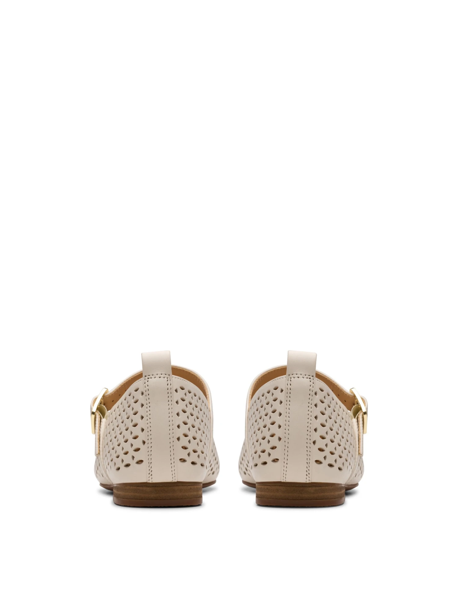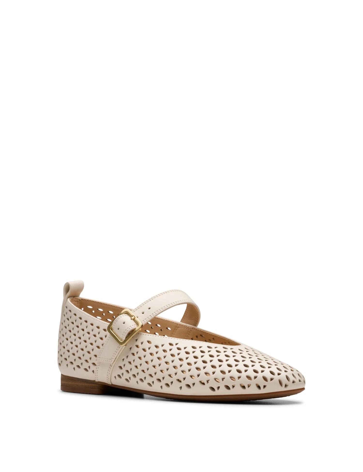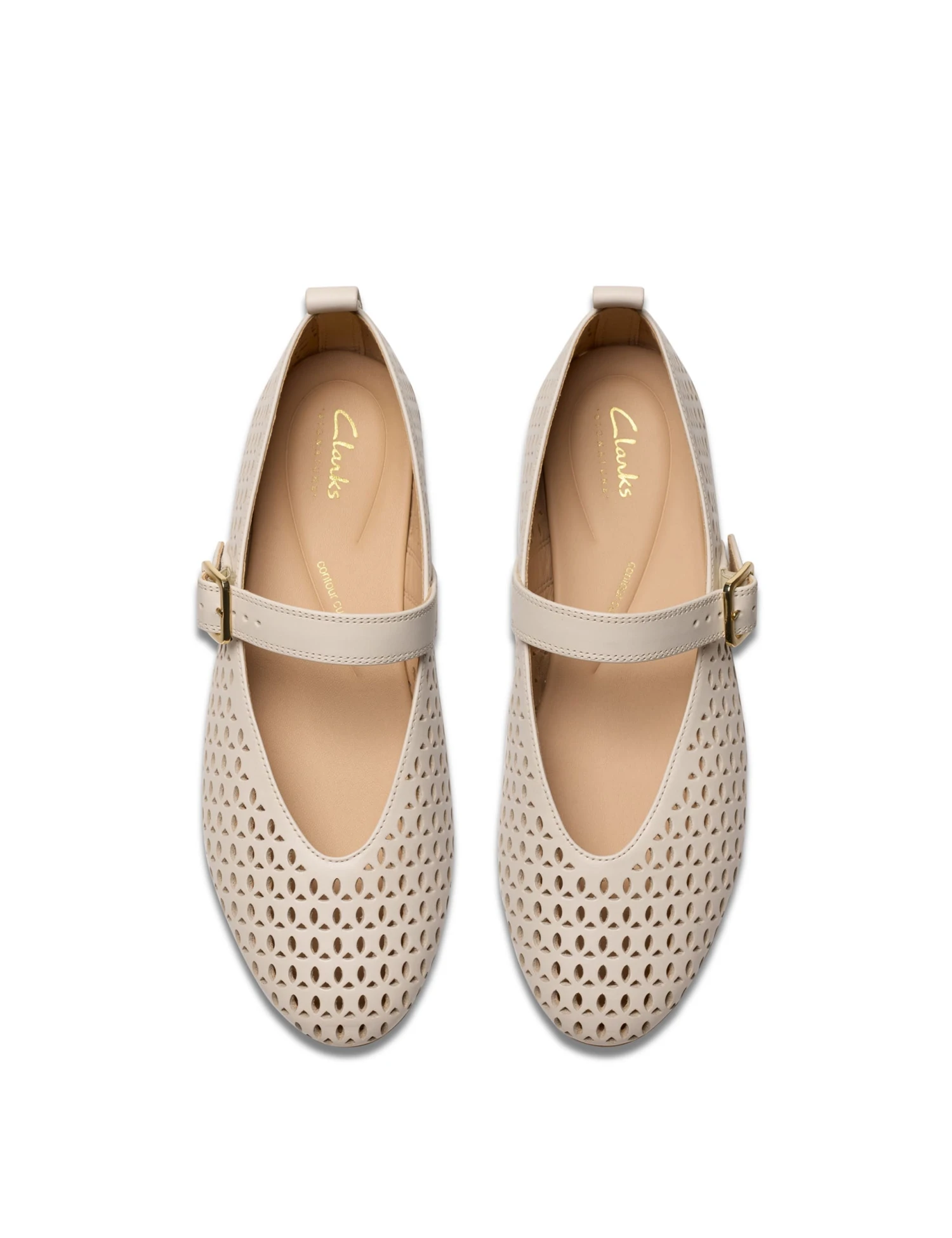 These leather Mary Jane ballet pumps from Clarks are the perfect lightweight pair for warmer weather. The front strap with an adjustable buckle closure provides a secure fit. They sit on a flat heel and feature leather uppers with open cutwork thatadds a touch of delicate, airy charm.