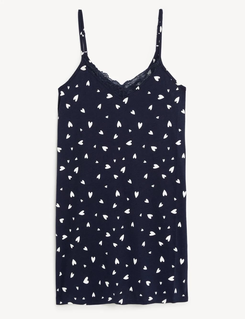 This short chemise is crafted from cotton-modal fabric that feels gentle on your skin. Easy regular fit, with adjustable straps at the shoulders. A playful heart print is complemented by a delicate lace trim at the v-neckline. Cool Comfort™ technology helps you feel fresh and comfy all night long.
