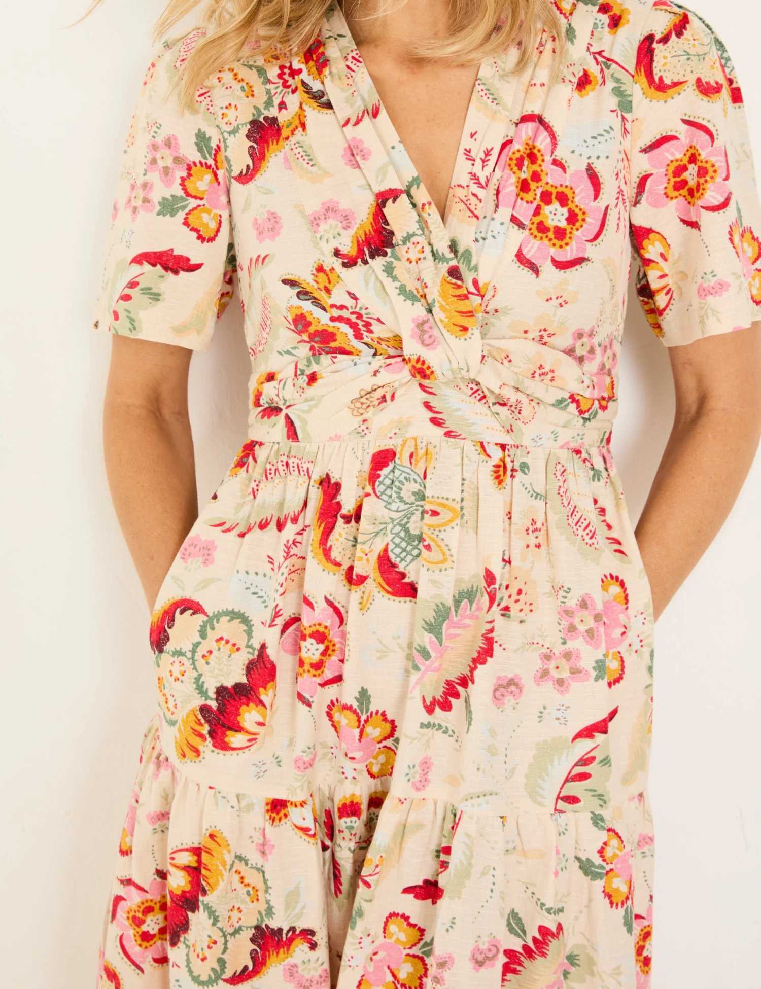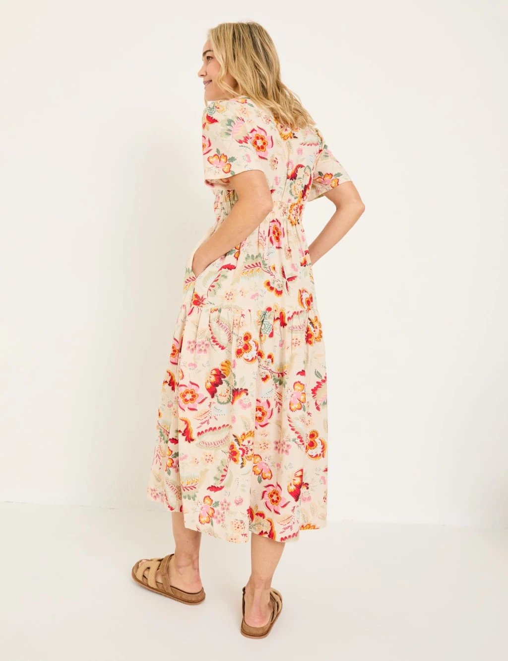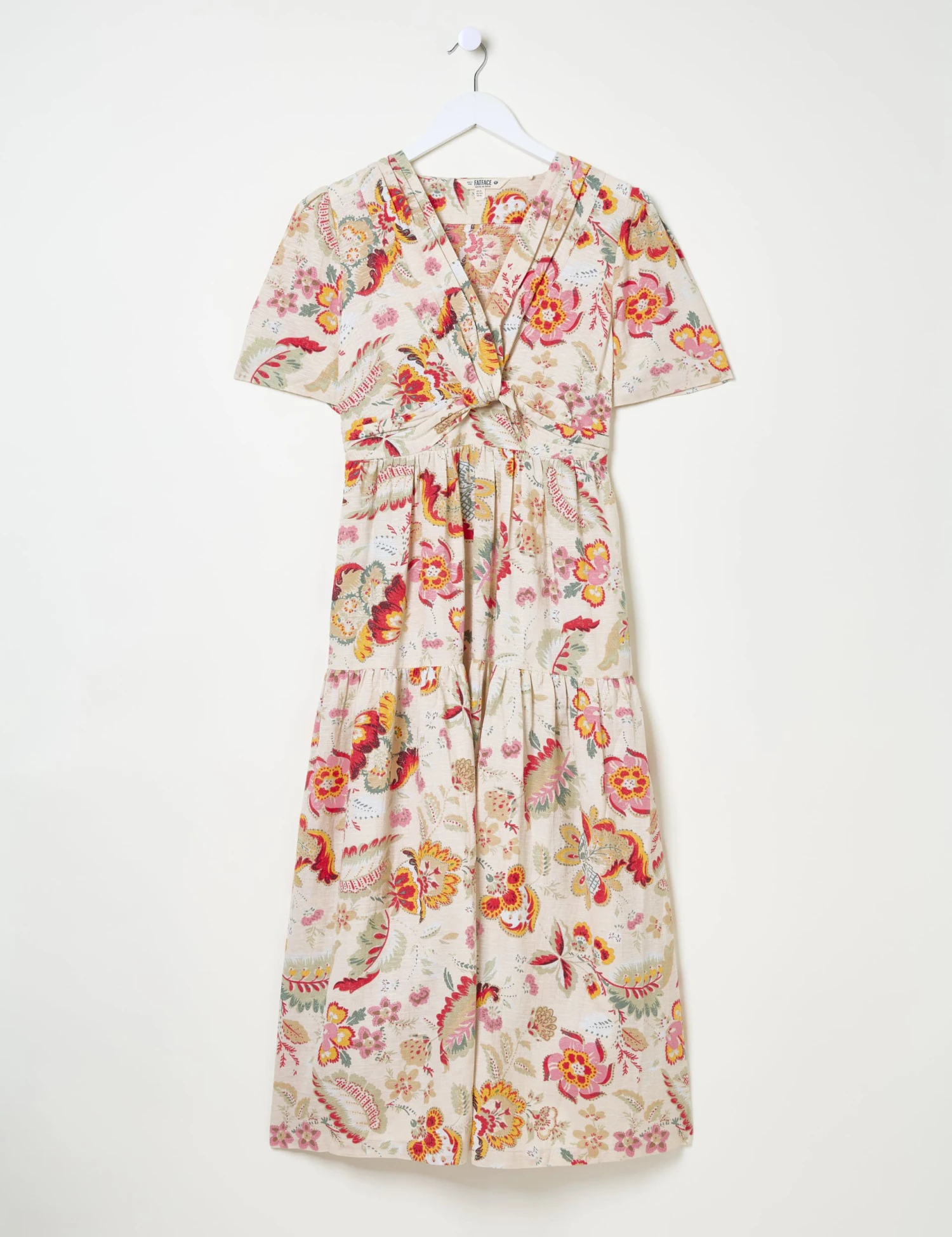 This cotton-blend floral dress from FatFace makes a striking choice for daywear. It’s made in a comfy regular fit, with a flattering v-neckline and knot detailing at the waist. The midi-length skirt features a tiered construction for extra twirly movement.