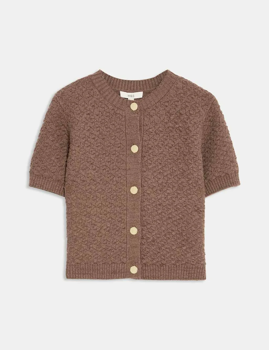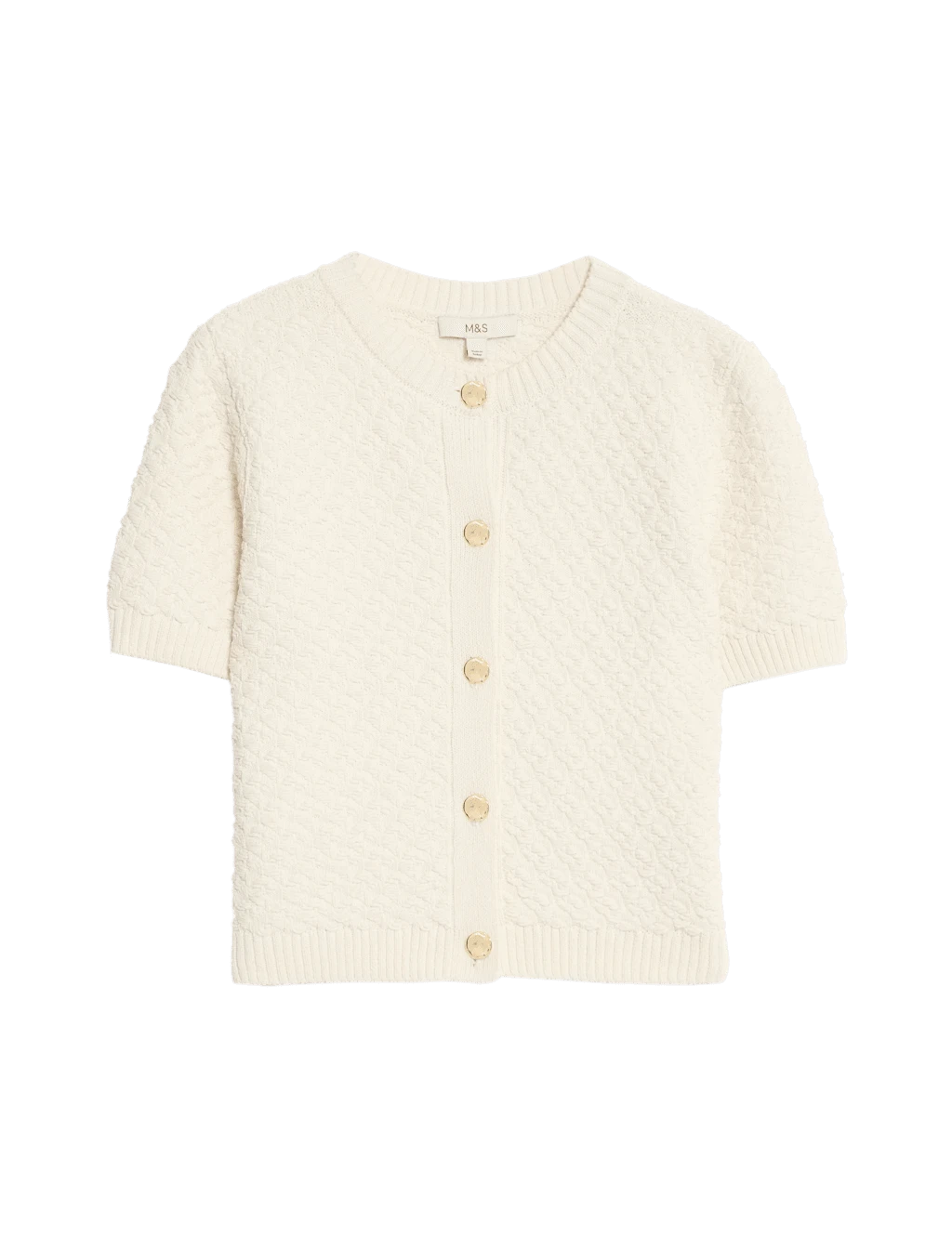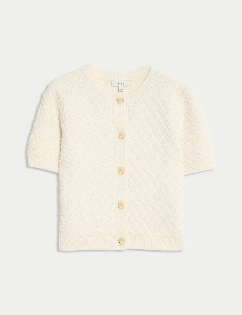 With its textured finish, this cotton-rich cardigan is a stylish addition to your knitwear collection. It’s designed in a flattering slim fit, with a cropped length and short sleeves for a light feel. The piece is complete with a timeless crew neckline and ribbed trims on the edges. M&S Collection: easy-to-wear wardrobe staples that combine classic and contemporary styles.