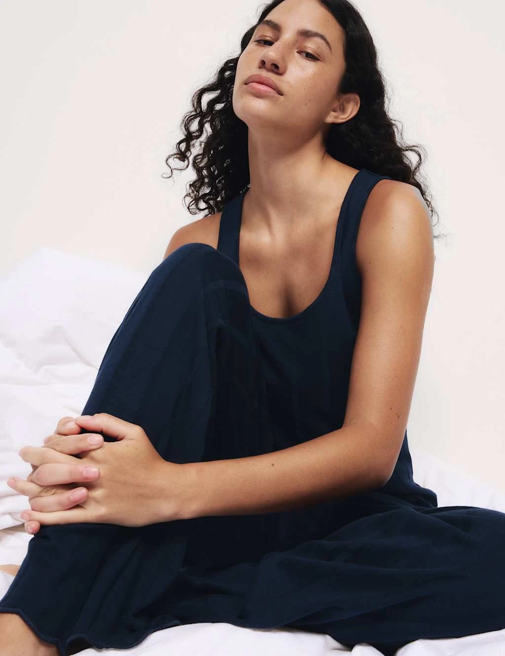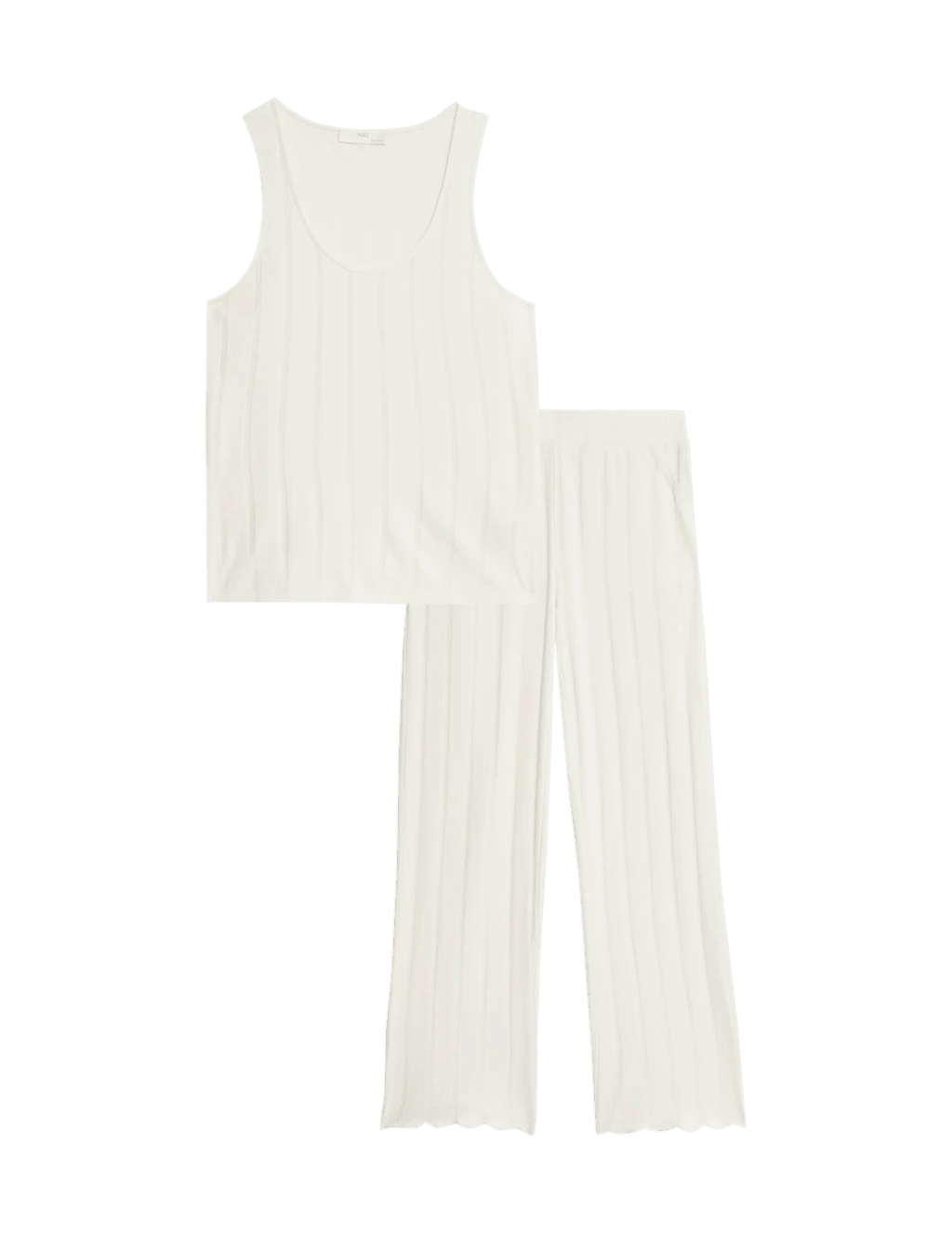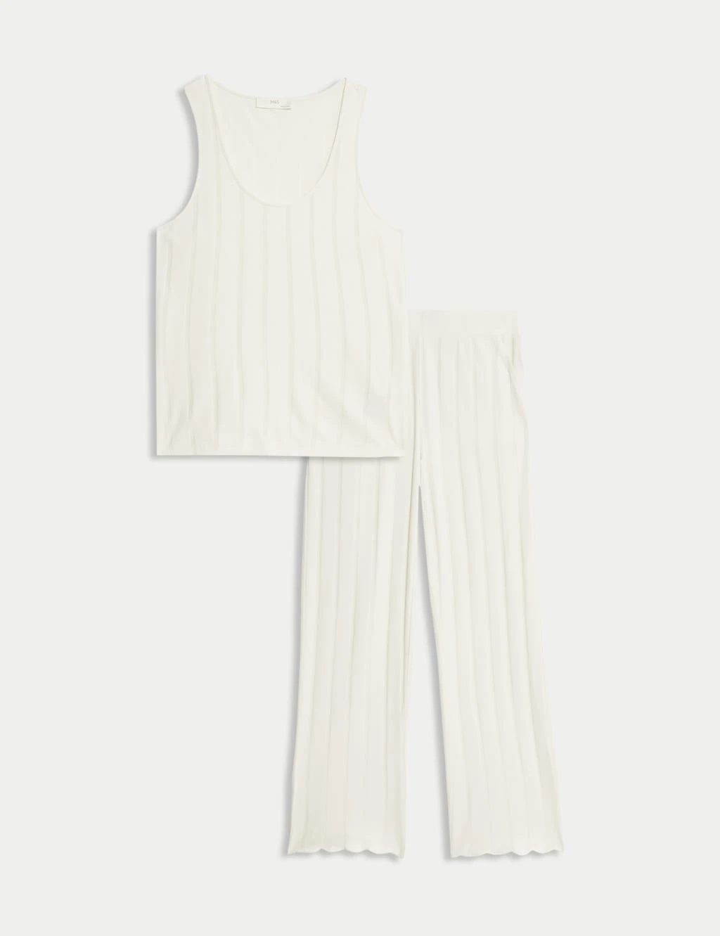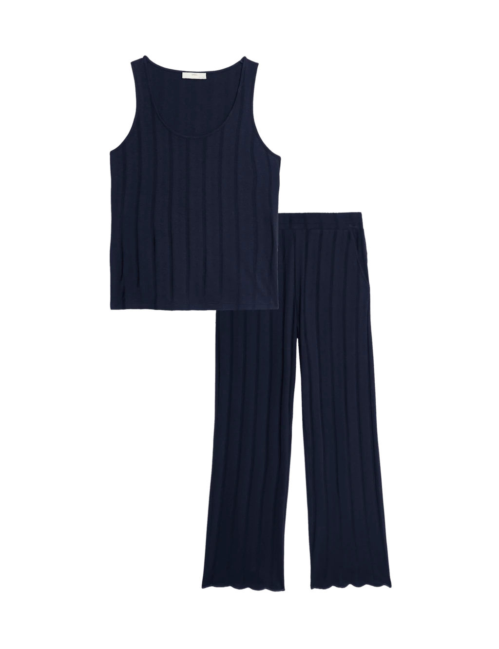 Crafted from soft cotton-modal, these pyjamas feel gentle on your skin. Comfy regular fit, with a cami top and full-length elasticated-waist bottoms. Features an all-over ribbed texture, and scallop edges at the ankles for a pretty finishing touch. M&S Collection: versatile styles in modern shapes with unique and playful details.