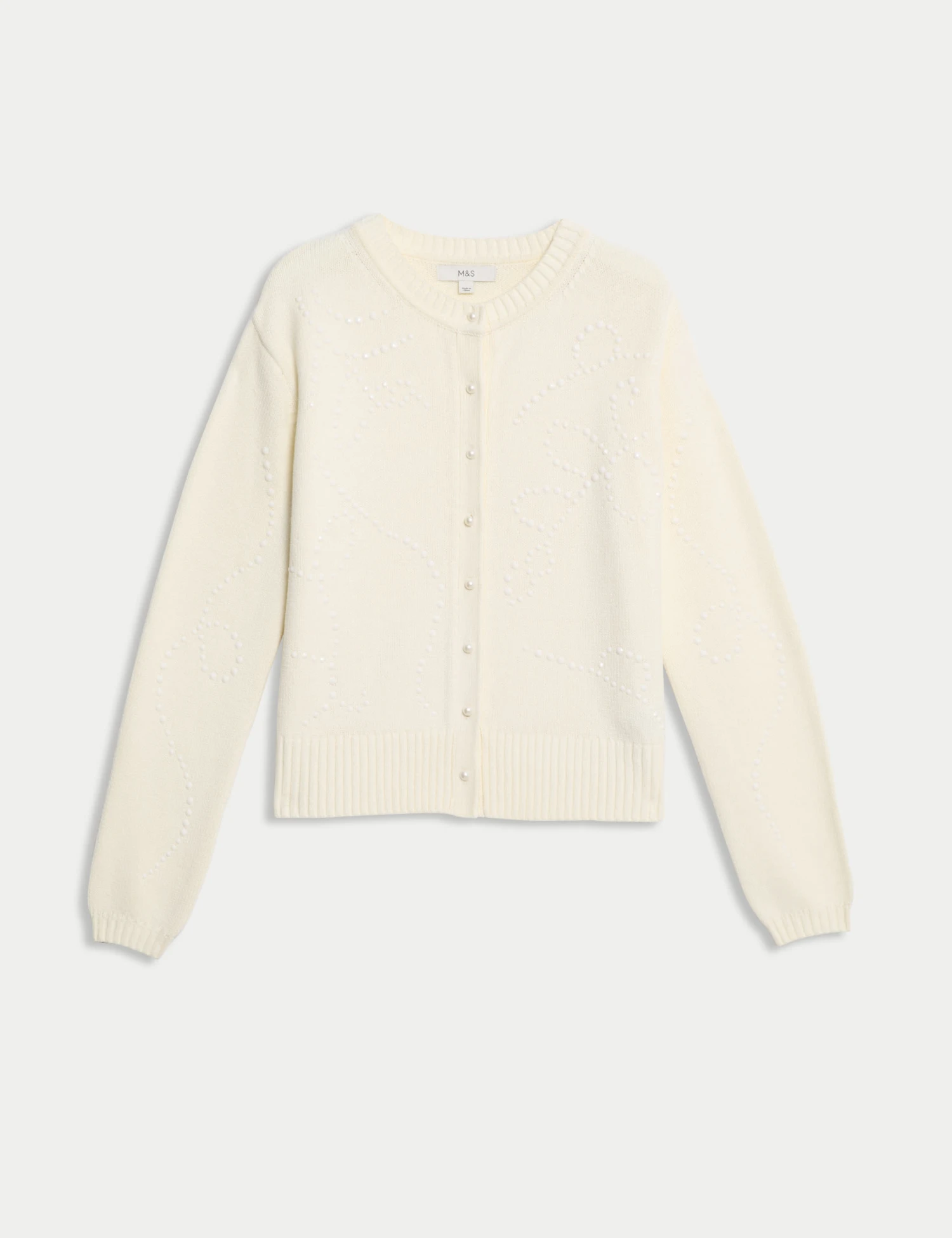 Layer up in style and comfort with this cotton-rich cardigan. The design features a neat crew neck and tactile tonal embellishments on the front and sleeves for an elegant look. Faux pearl buttons maintain the chic aesthetic, while chunky ribbed trims on the collar, cuffs and hem add smart finishing touches. M&S Collection: easy-to-wear wardrobe staples that combine classic and contemporary styles.