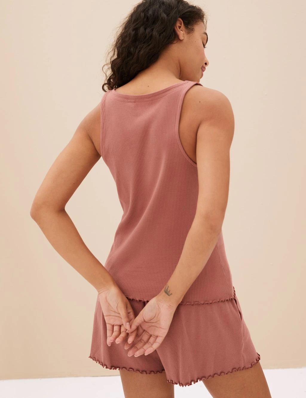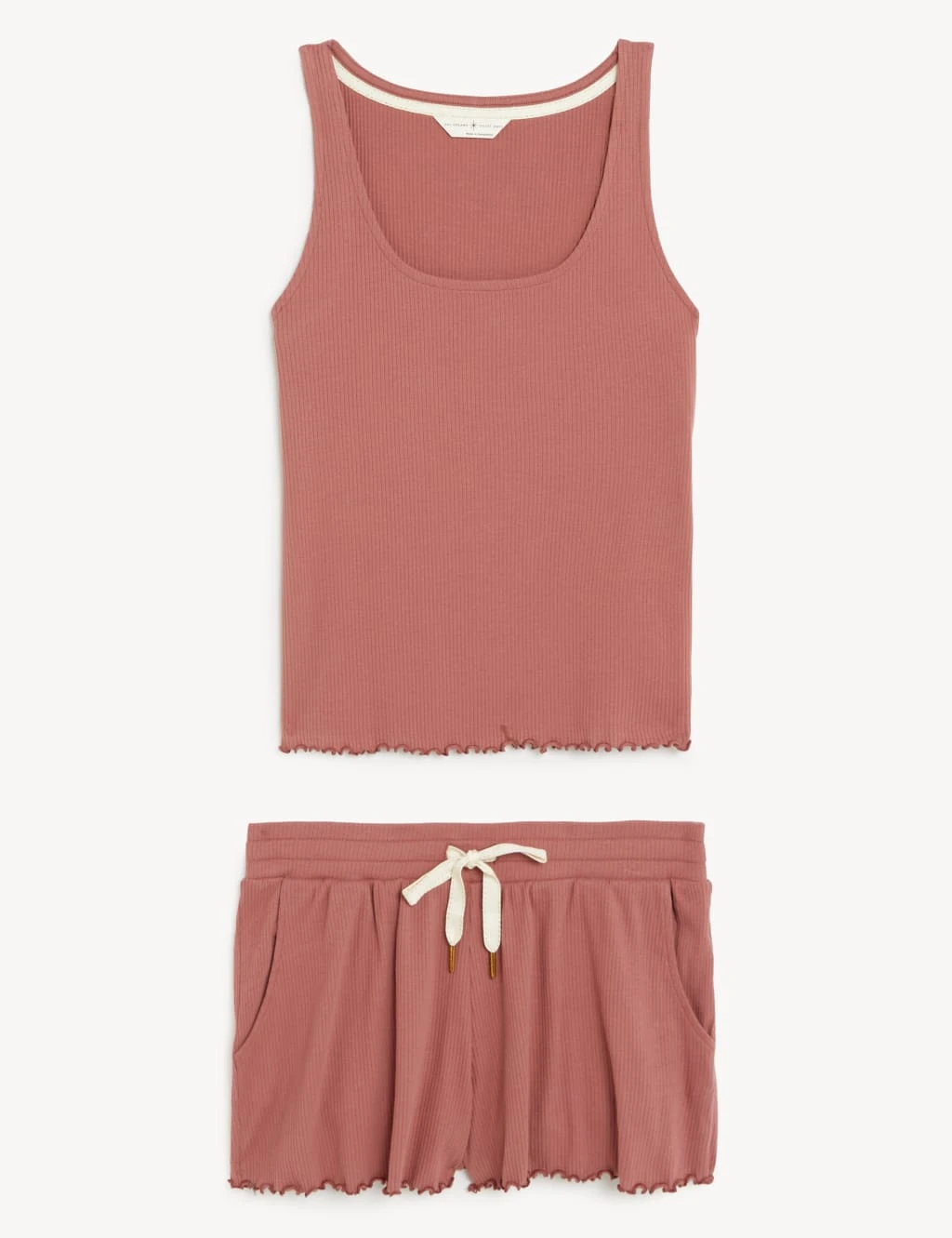 Keep your cool on warmer nights in these breathable cotton-rich pyjamas. They’re cut to a comfy regular fit, in a sleeveless shortie style. The bottoms have an adjustable drawstring waist, plus handy pockets at the hips. A ribbed texture and lettuce hems add subtle detail, while added stretch gives a smooth, easy wear. M&S Collection: versatile styles in modern shapes with unique and playful details.