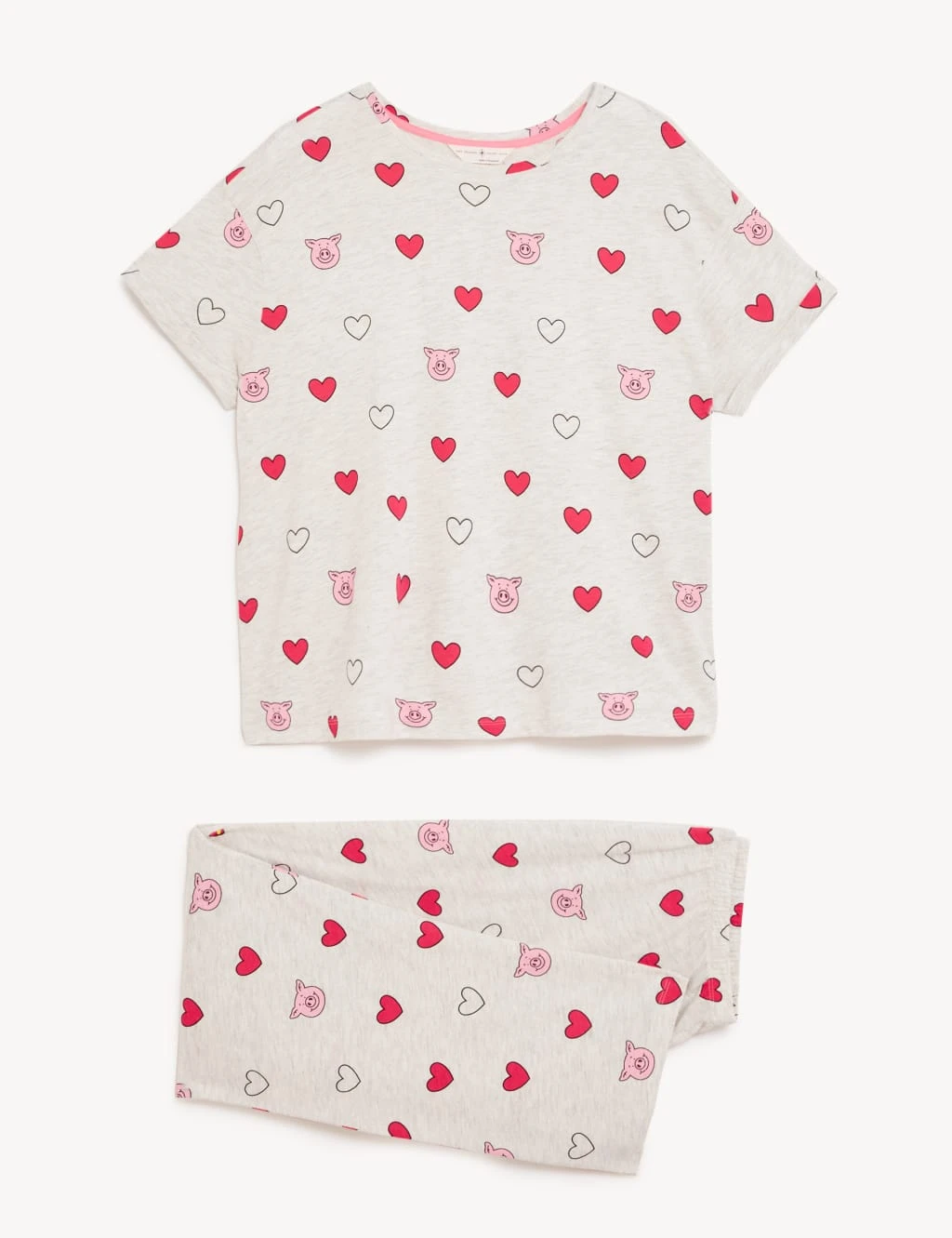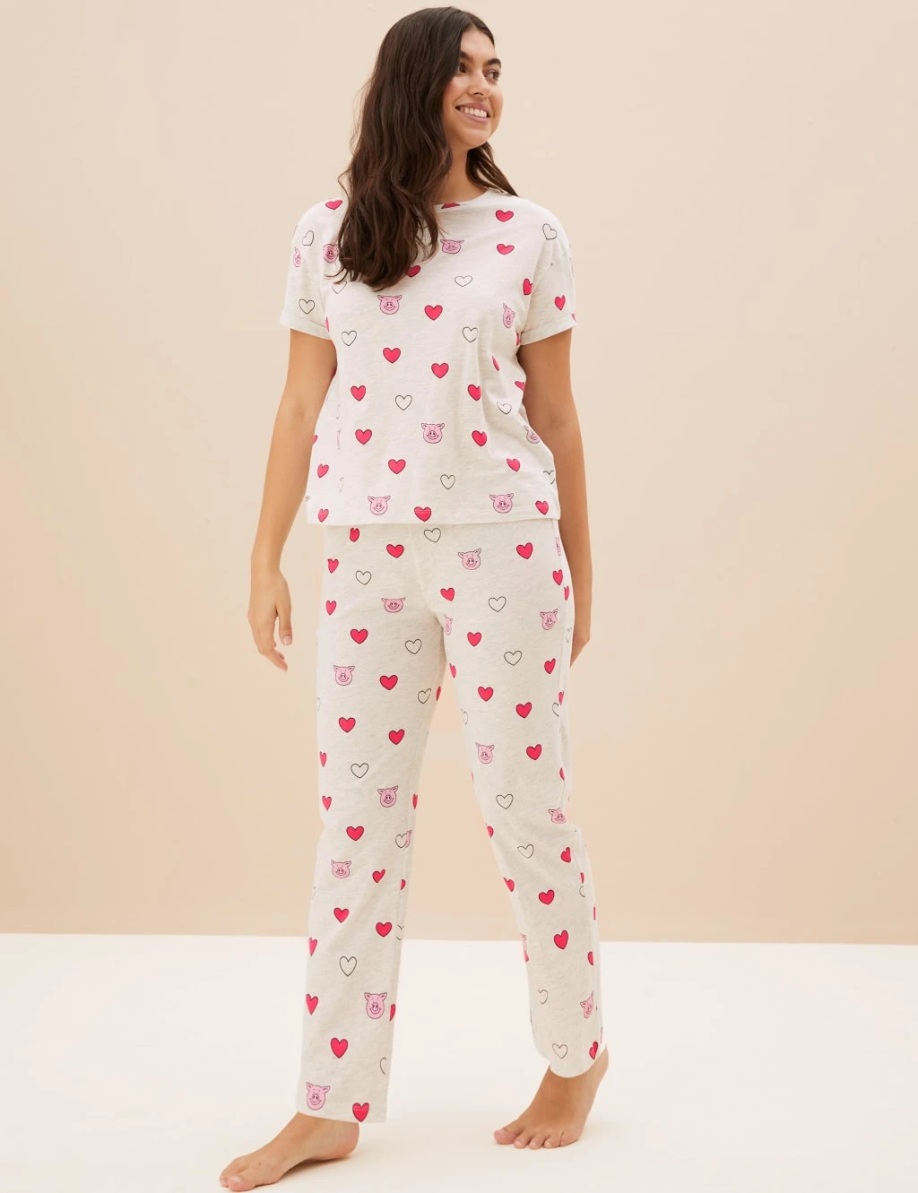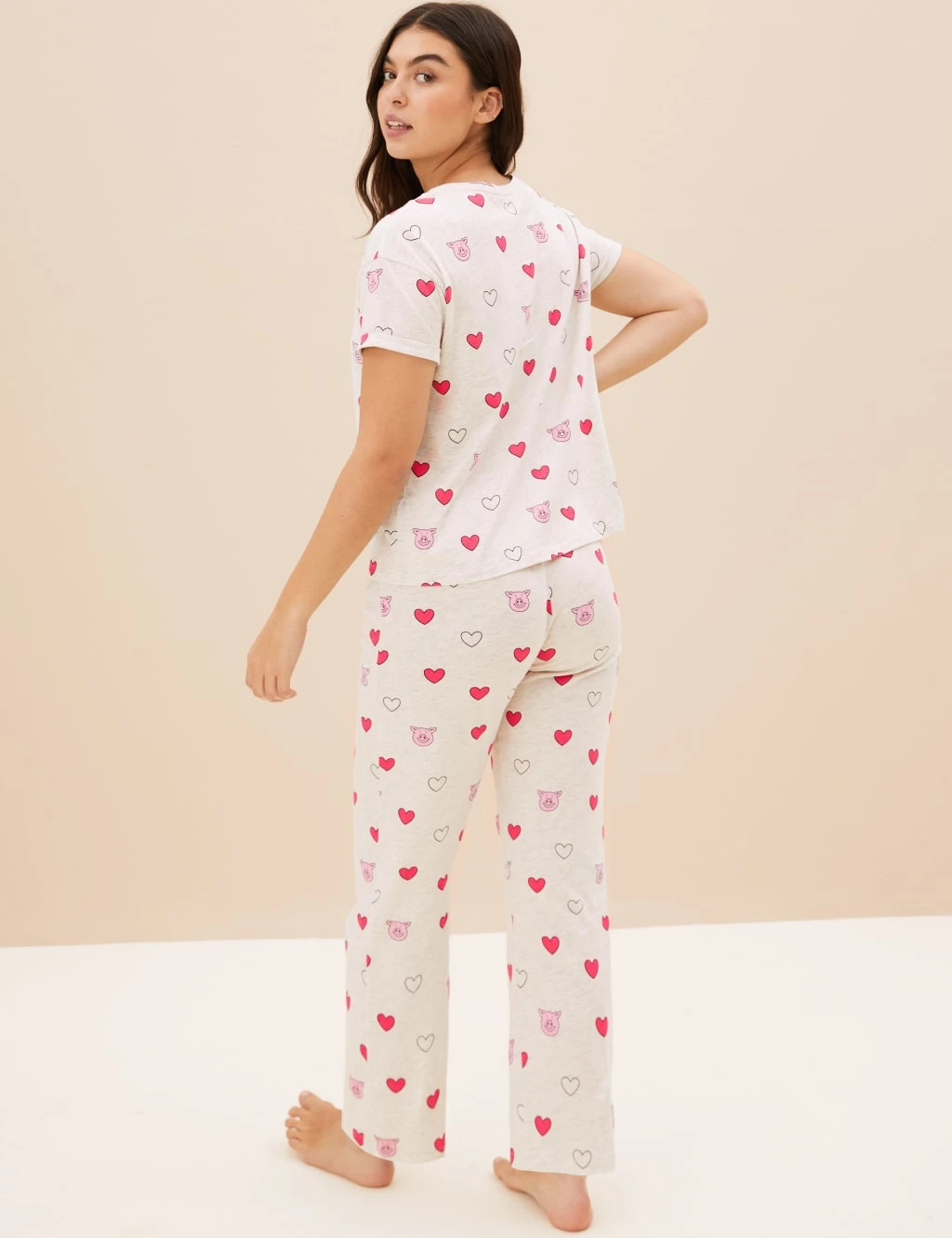 Bring extra fun to your nightwear with these cotton-rich Percy Pig™ pyjamas. Made in a regular fit. The top has short sleeves and the full-length bottoms feature an elasticated waist for comfort. The print shows Percy’s smiling face among a sprinkling of hearts. StayNew™ technology keeps your jammies looking their best for longer.