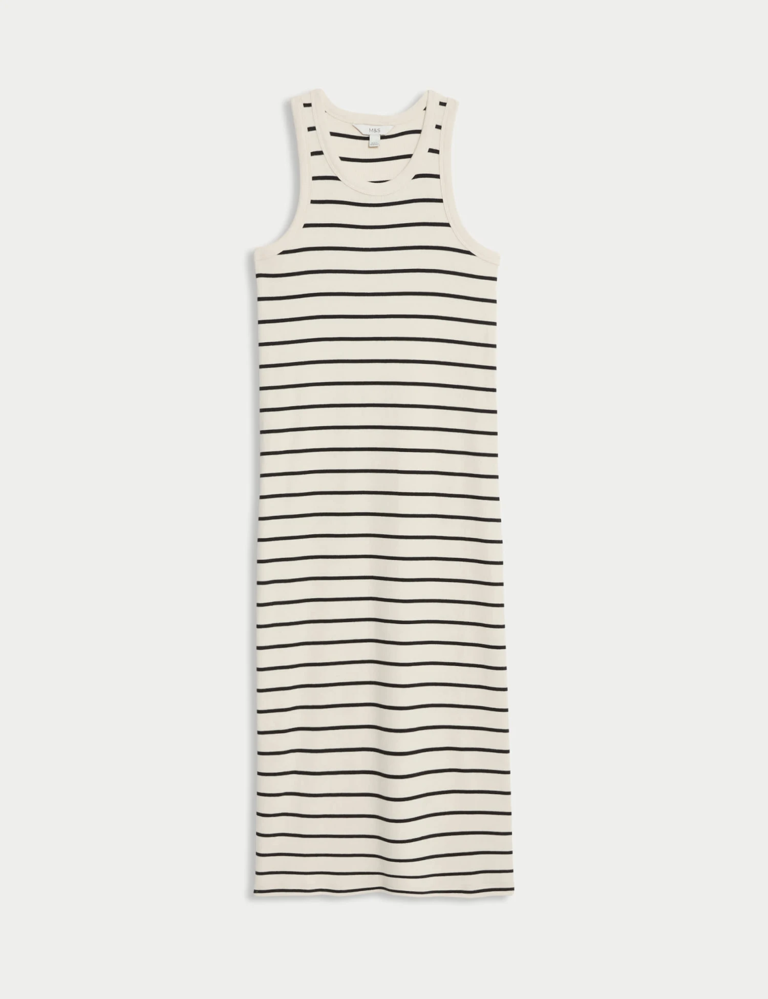 This cotton-rich column dress is a versatile piece to wear on warm days. It’s cut in a flattering fitted shape, with added stretch in the ribbed fabric for easy movement. The round neckline and all-over striped design create a timeless aesthetic. A sleeveless silhouette gives a comfy feel, while the midi-length hem offers an elegant finish. M&S Collection: easy-to-wear wardrobe staples that combine classic and contemporary styles.