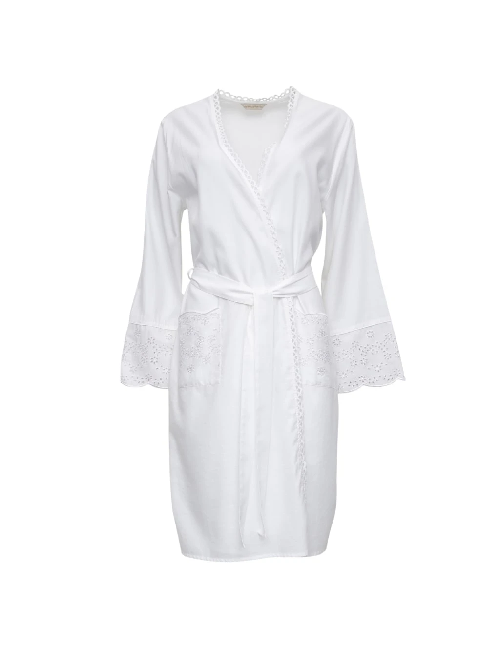 This short cotton-modal dressing gown from Cyberjammies features delicate embroidered cutwork detailing. It’s cut to a regular fit, with a kimono-style wrap front that’s tied with a belt. There’s an embroidered trim along the edges, with larger cutwork panels at the cuffs. The piece is finished with two handy patch pockets.