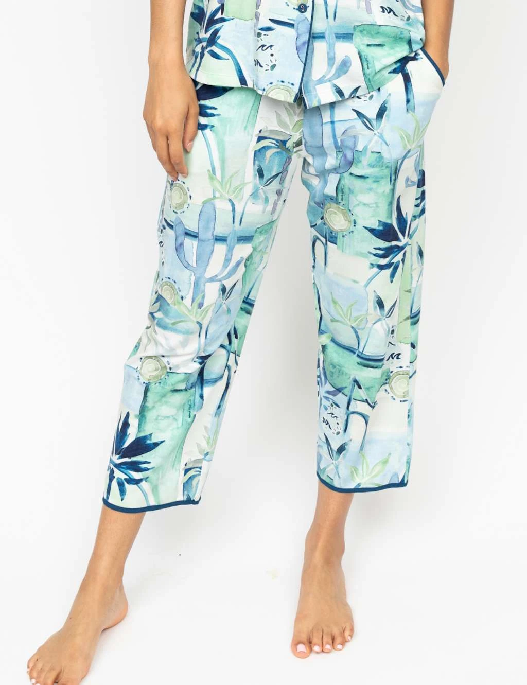 With their tropical watercolour print, these cotton modal pyjama bottoms from Cyberjammies are a pretty choice for lounging. They’re crafted from soft jersey fabric in a regular fit, with a cropped length for a contemporary look. A contrast drawstring at the waist is complemented by contrasting piping at the side pockets and cuffs for premium detail.