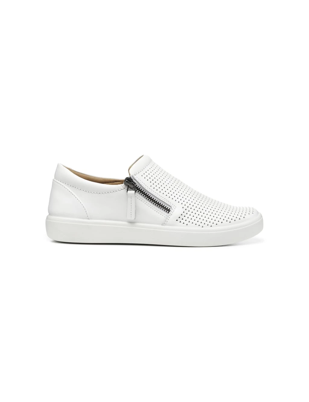 Stroll around town in premium comfort in these Daisy leather deck shoes by Hotter. Made in a regular fit, these casual essentials have a flat heel, modern side-zip fastening and a distinctive perforated pattern on the upper. Cushion+ technology helps to reduce fatigue by returning up to 45% of your energy with each step. The breathable Ortholite® insole provides supportive underfoot cushioning, making it a practical choice for days on the move. A contrast rubbery outsole adds a street-style finish.
