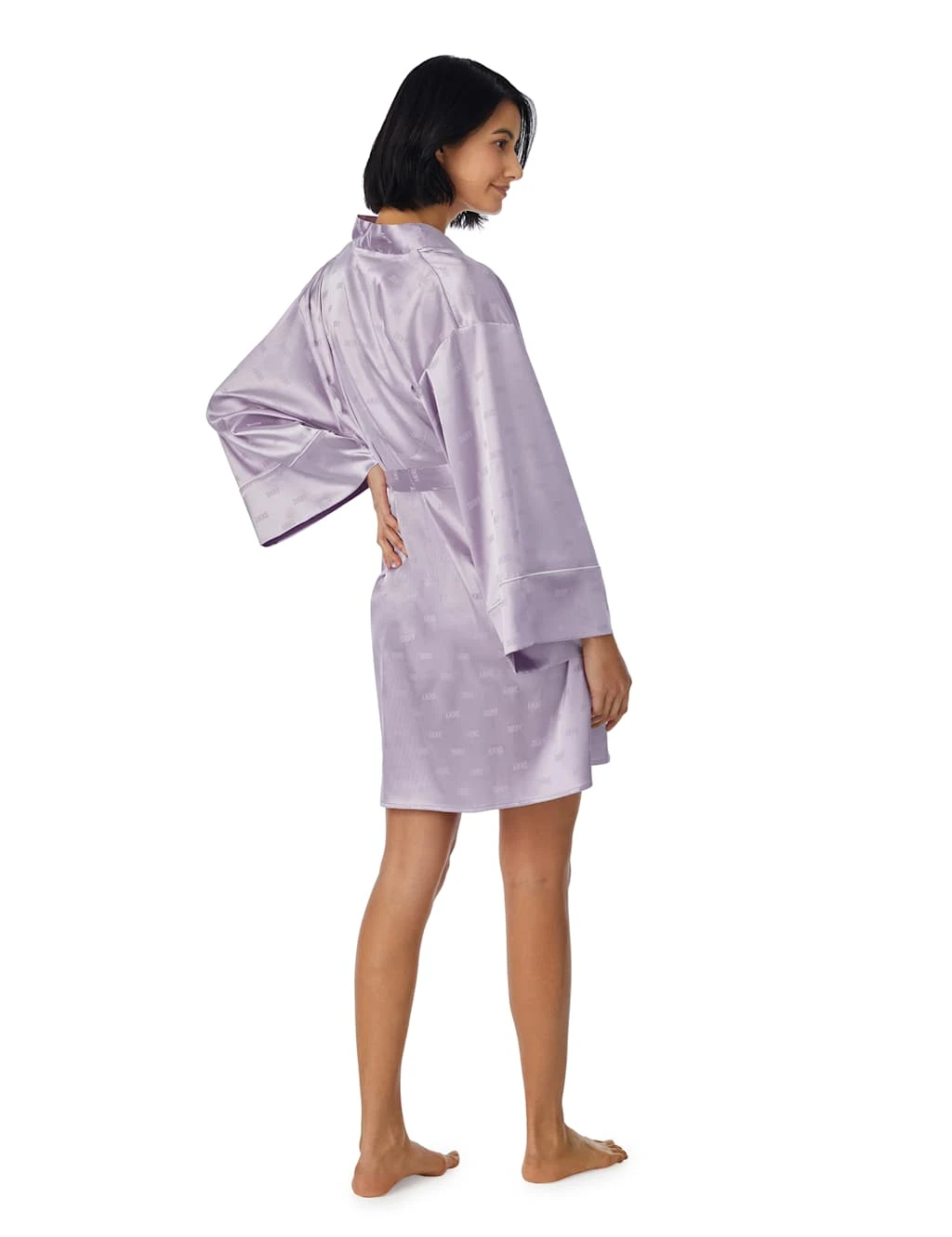 Elevate your sleepwear collection with this soft satin kimono robe from DKNY. It’s made in a comfy regular fit, with a flattering belted waist. This luxurious piece falls to a short length and has long sleeves. All-over jacquard DKNY lettering adds a signature touch.