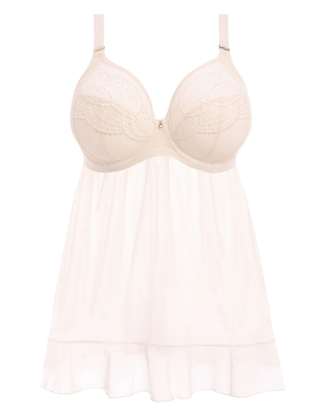Delicate embroidery brings a romantic feel to this sheer chemise from Elomi. The supportive wired cups create a flattering plunge neckline, while adjustable straps and a hook-and-eye fastening ensure a perfect fit. Gathering under the bust adds a touch of floaty volume to the skirt, which features a frilled hem for a playful finish.