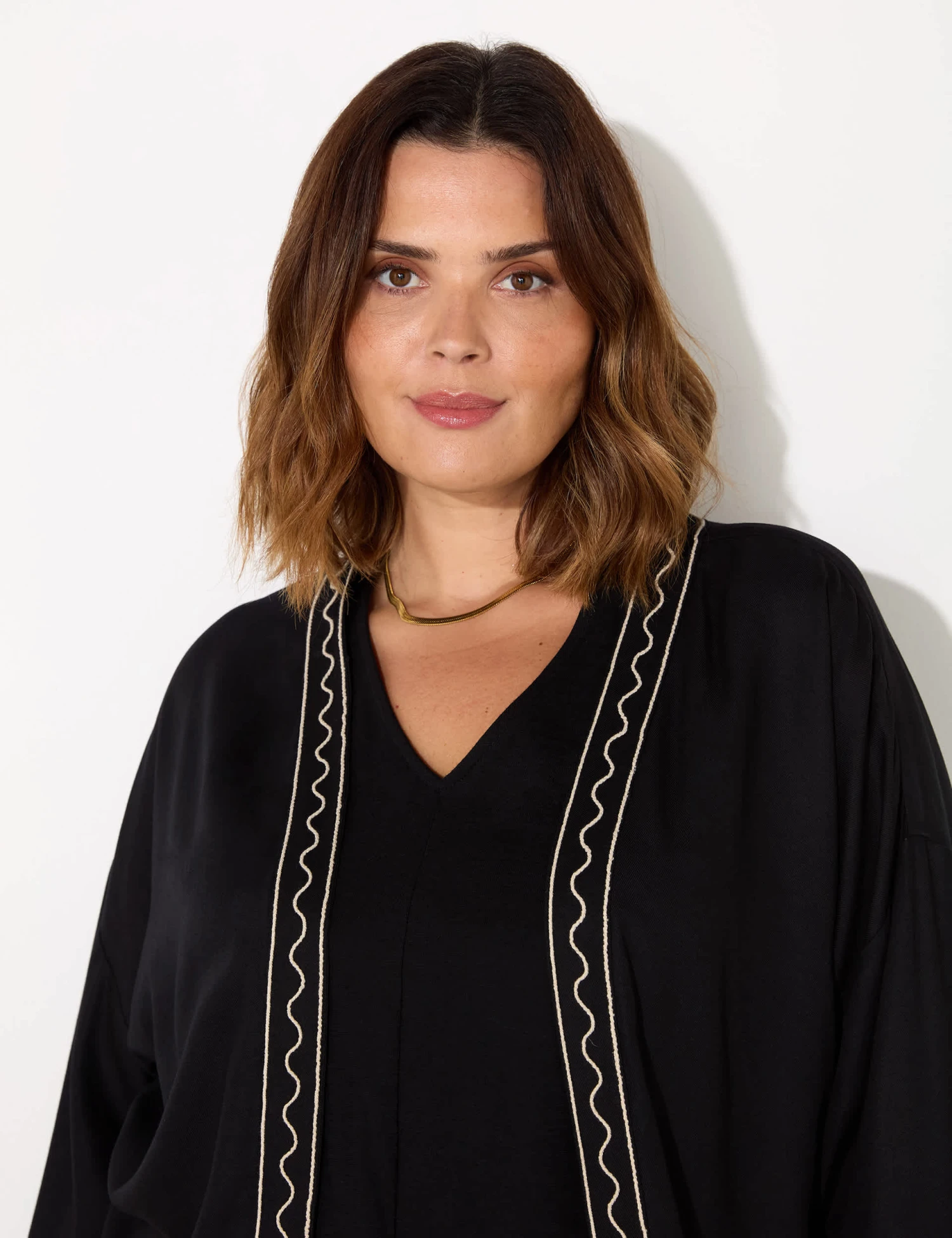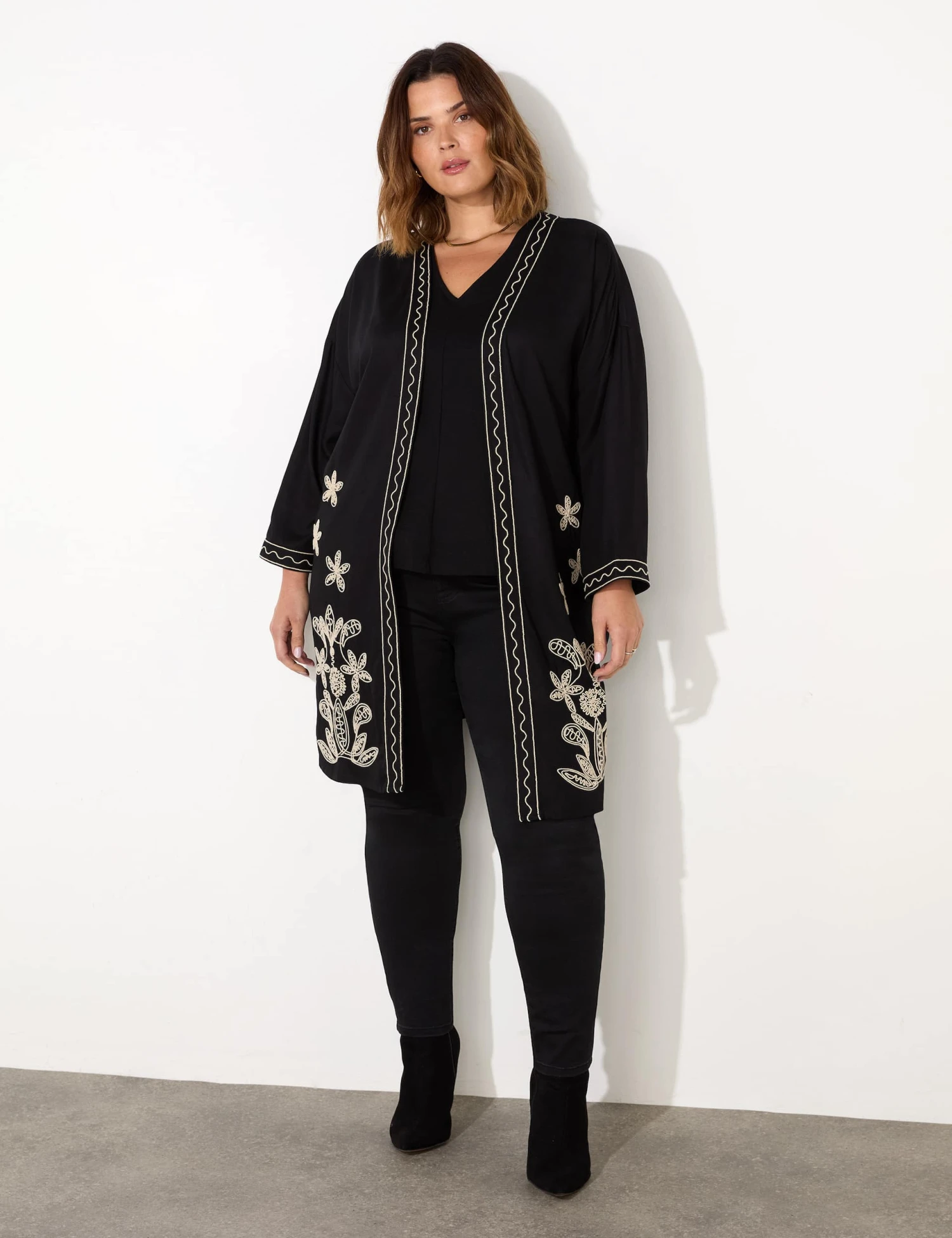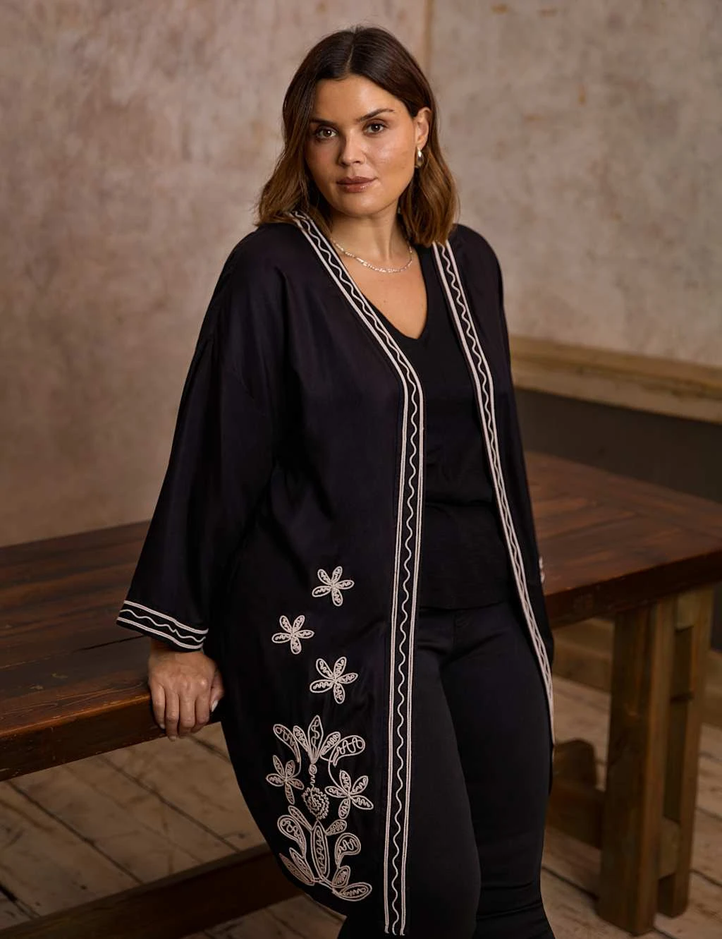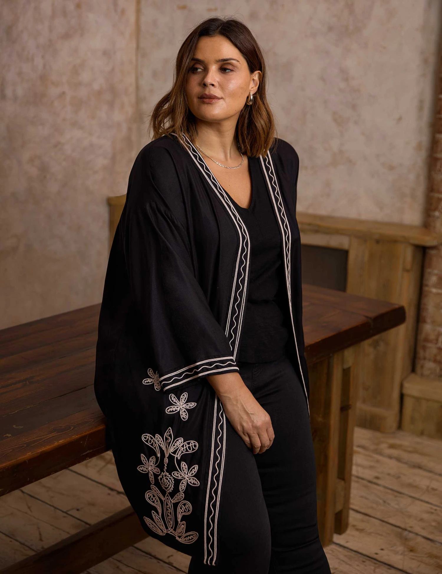 This Live Unlimited London kimono is a sophisticated way to layer up. It’s made in a regular fit, with an open front and an elegant longline silhouette. The intricate design of the contrast embroidery at the front and back adds a striking look. This piece is complete with long wide sleeves for a touch of volume.