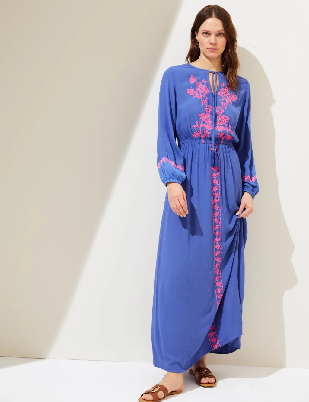 This beach dress is embroidered for a feminine flourish. It’s crafted in a regular fit, with long blouson sleeves and a maxi hem giving extended coverage. An elasticated waist offers a flattering shape, while a tassel tie at the v-neck creates a playful pop.