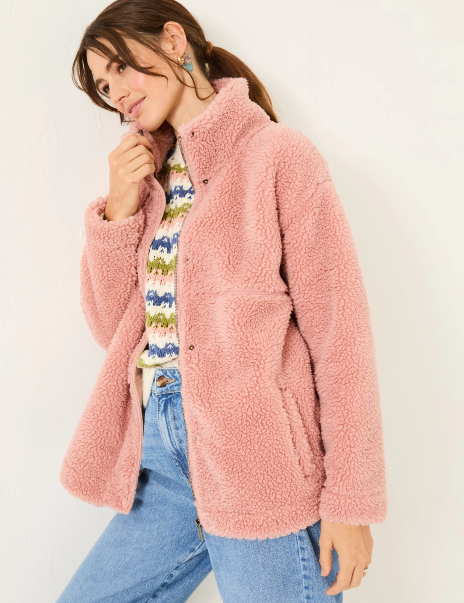 Stay cosy on cooler days with this borg-textured fleece jacket from FatFace. It’s designed in an easy regular fit, with a funnel neckline to keep you extra snug. A zip and popper fastening runs down the front. The long sleeves feature dropped shoulders for a slouchy relaxed look, while side pockets provide room for your on-the-go essentials.