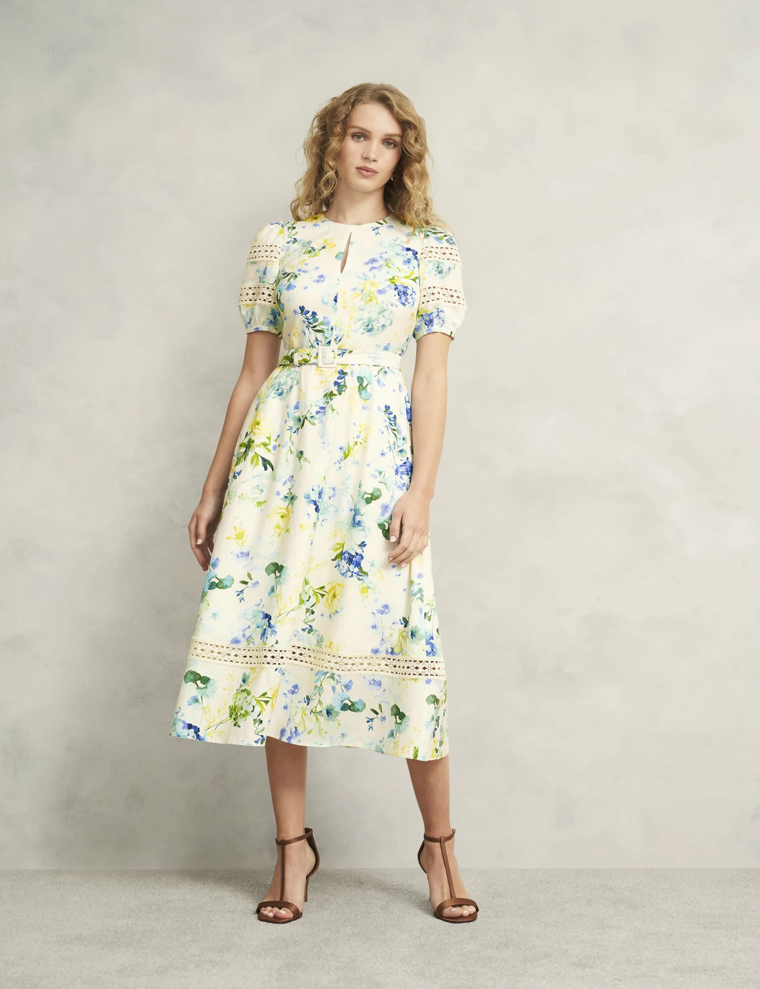 This elegant midi dress from Hobbs is crafted from lightweight fabric featuring a touch of linen. It’s designed in a regular fit with a fit-and-flare silhouette for a flattering shape. The short puff sleeves and crew neck offer a neat look, while the bold floral print provides a striking effect. This piece is complete with a concealed back zip fastening.