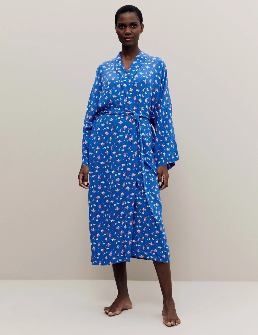 This kimono-style robe is cut to an elegant full length. The tie waist fastening provides versatility and is fixed at the back with soft ruching detailing. Retro inspired shell edge stitching around the neckline adds the finishing feminine touch. Made with responsibly produced fibres. M&S x GHOST lingerie and sleepwear. An exclusive collection created in collaboration with Ghost using signature floral prints, beautifully soft fabrics, vintage inspired details and gold Ghost branding. The collection is designed to mix and match, and style your way.