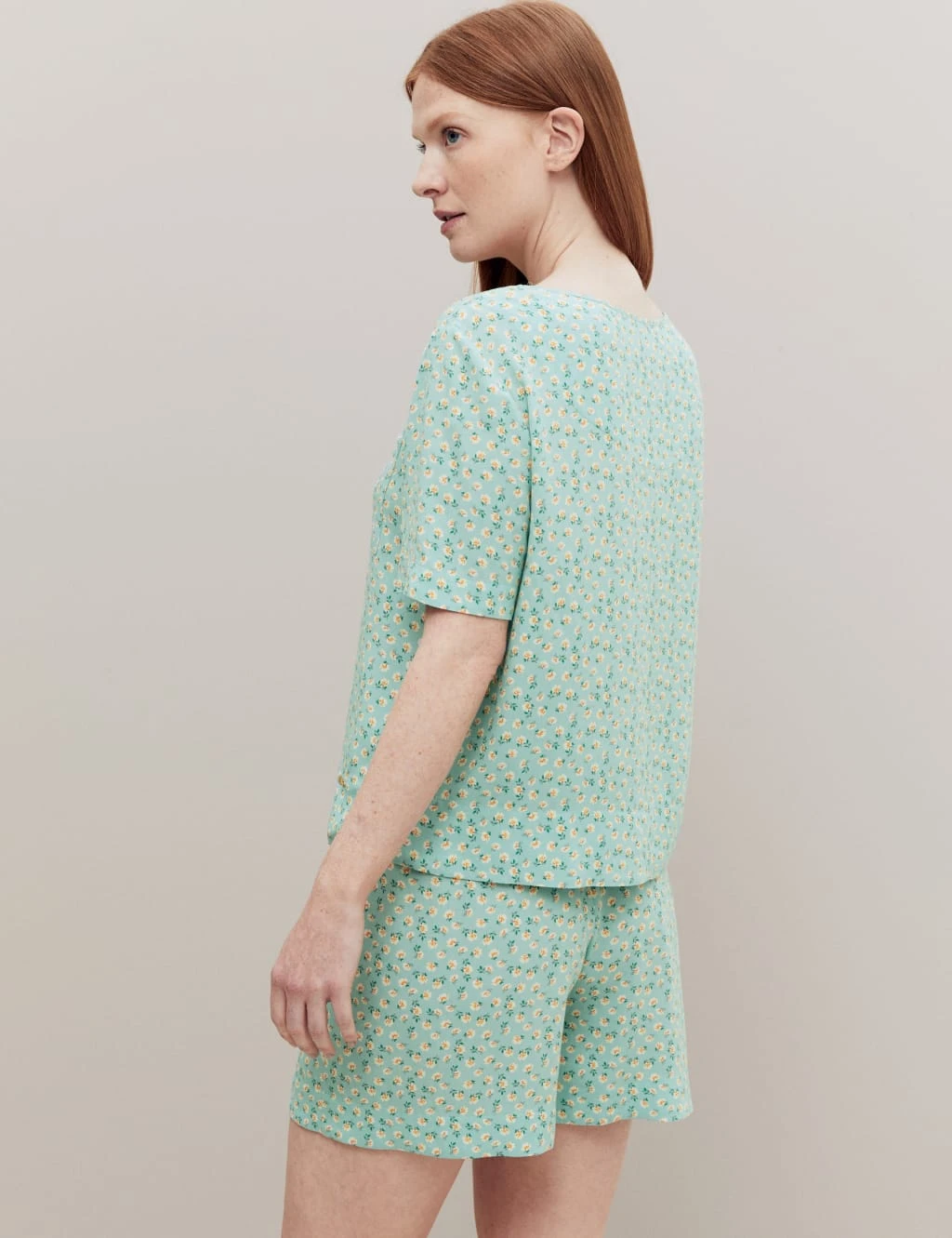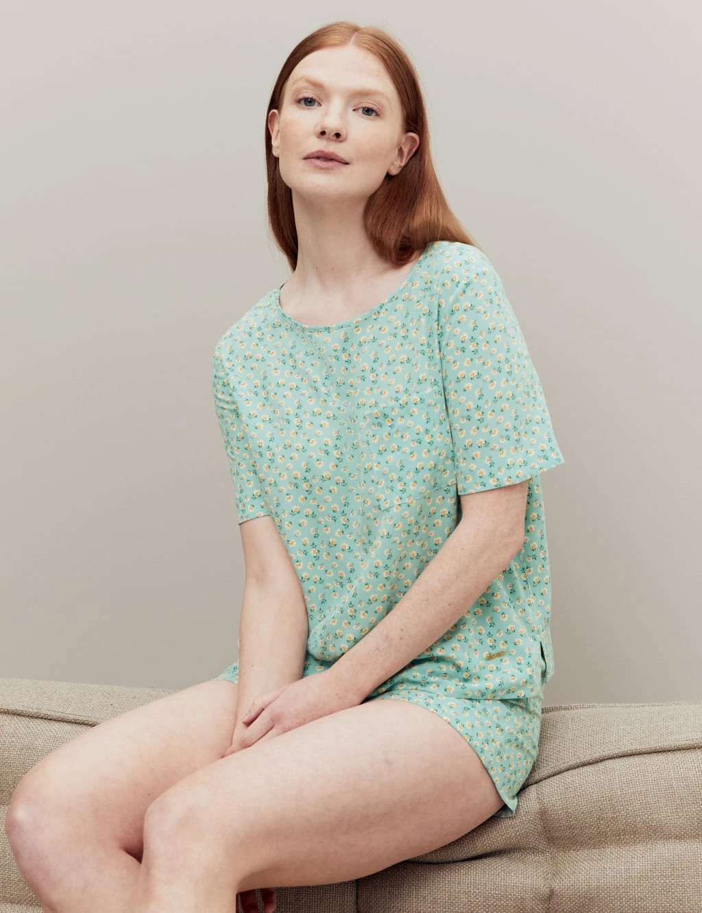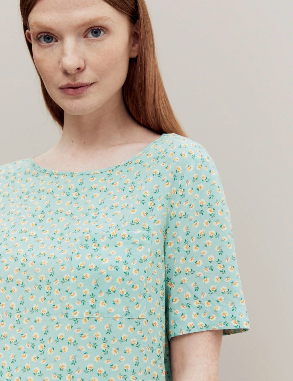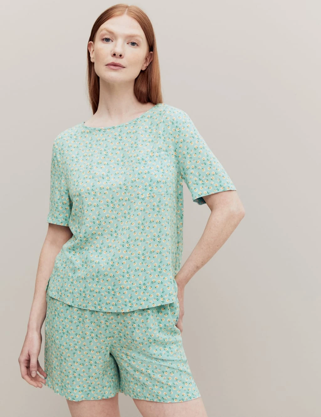 This T-shirt inspired pyjama top is designed in soft and fluid woven fabric. A round neckline and flattering sleeve length create an elegant silhouette. Retro inspired shell edge stich detailing and a patch pocket adds the finishing touches. Made with responsibly produced fibres. M&S x GHOST lingerie and sleepwear. An exclusive collection created in collaboration with Ghost using signature floral prints, beautifully soft fabrics, vintage inspired details and gold Ghost branding. The collection is designed to mix and match, and style your way.
