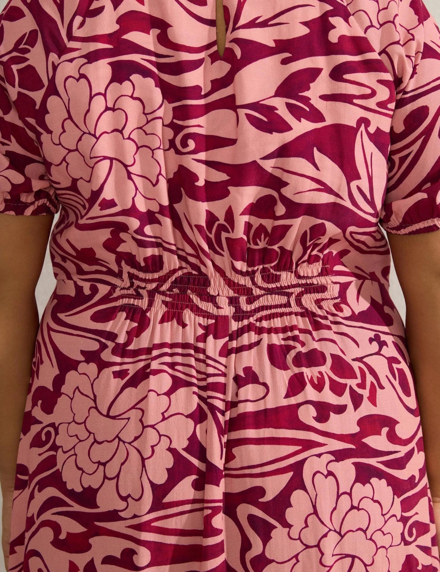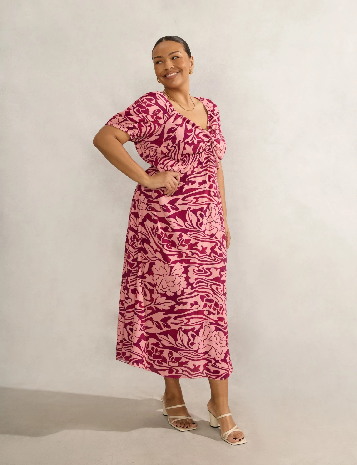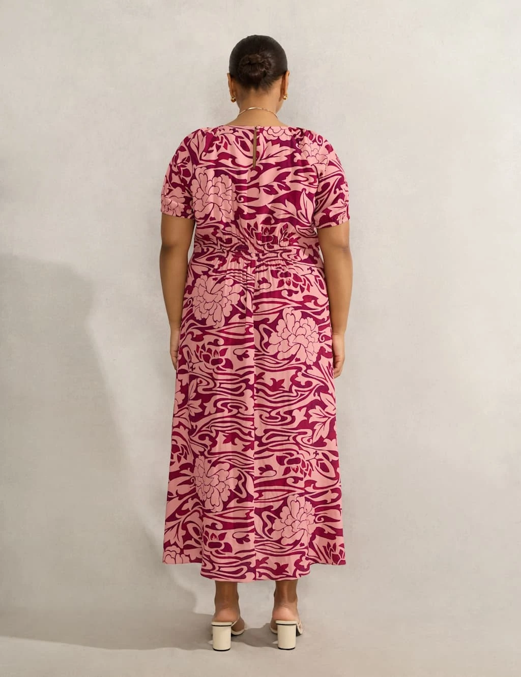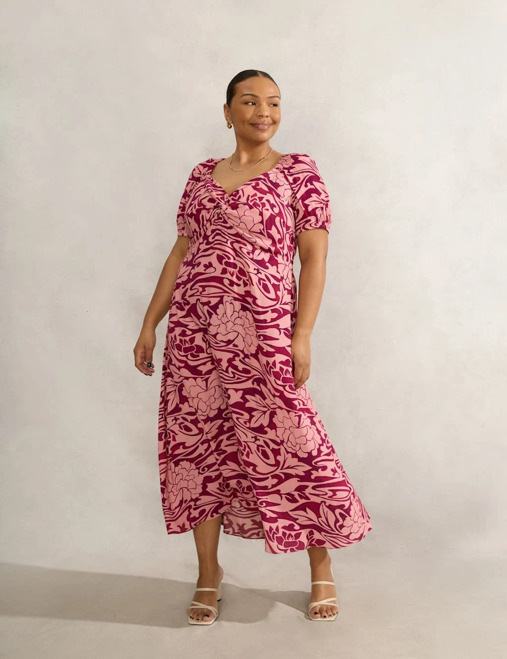 This maxi-length floral tea dress from Live Unlimited London is full of feminine details. Regular fit with a v-neck and short puff sleeves. Pretty twist front and an elasticated shirred waist at the back. Keyhole back button fastening.