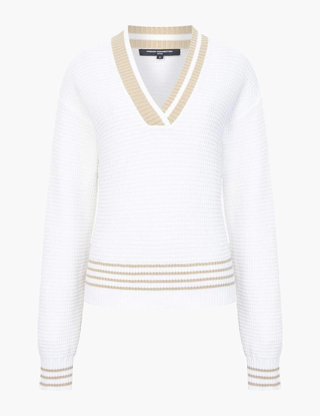 This pure cotton jumper from French Connection is a stylish take on the varsity trend. It’s knitted in a comfy regular fit, with a bold striped trim at the v-neckline, cuffs and hem. The long sleeves are dropped at the shoulders for a casual feel. Ribbed trims complete the look.