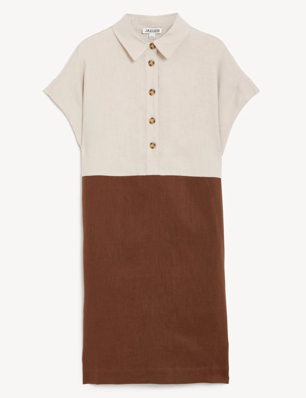 This breathable pure linen mini shift dress from Jaeger is a work wardrobe hero. It’s crafted in a regular fit and features a bodice with short grown-on sleeves and a contrast colour straight skirt. With its neat collared neck and statement mock horn buttons on the bodice, this dress has a smart feel. Wear it with a cropped blazer and neutral slingbacks for a polished look.