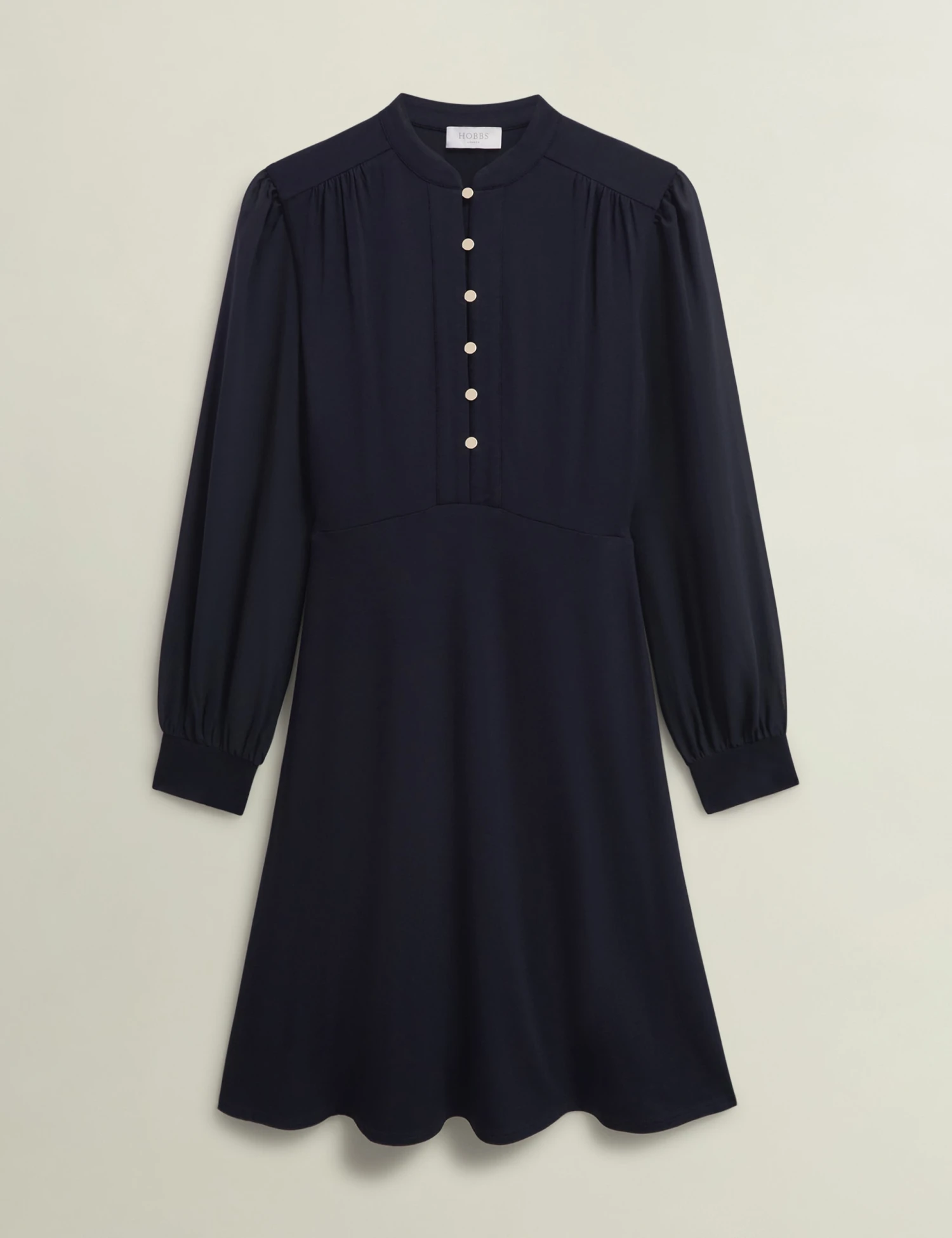 This jersey skater dress from Hobbs is a versatile choice for smart occasions. The regular-fit design is cut in a figure-flattering fit-and-flare shape, with long sleeves and a neat high neckline. Gold-tone buttons on the bodice add luxe detail, while the hemline sits at a graceful knee length.