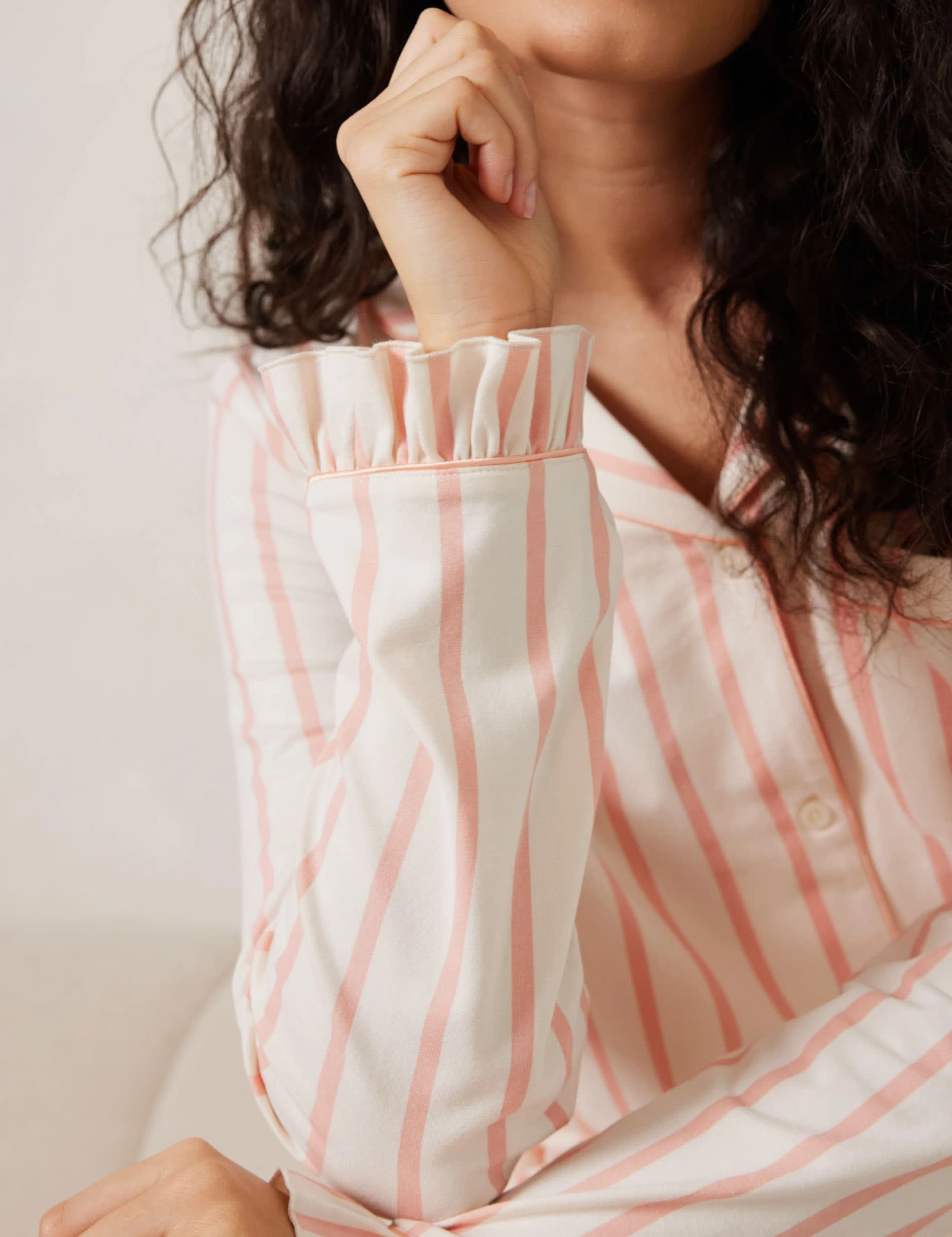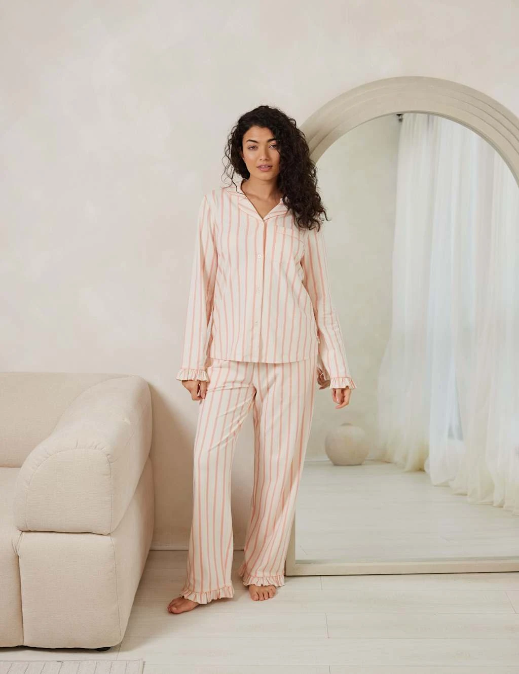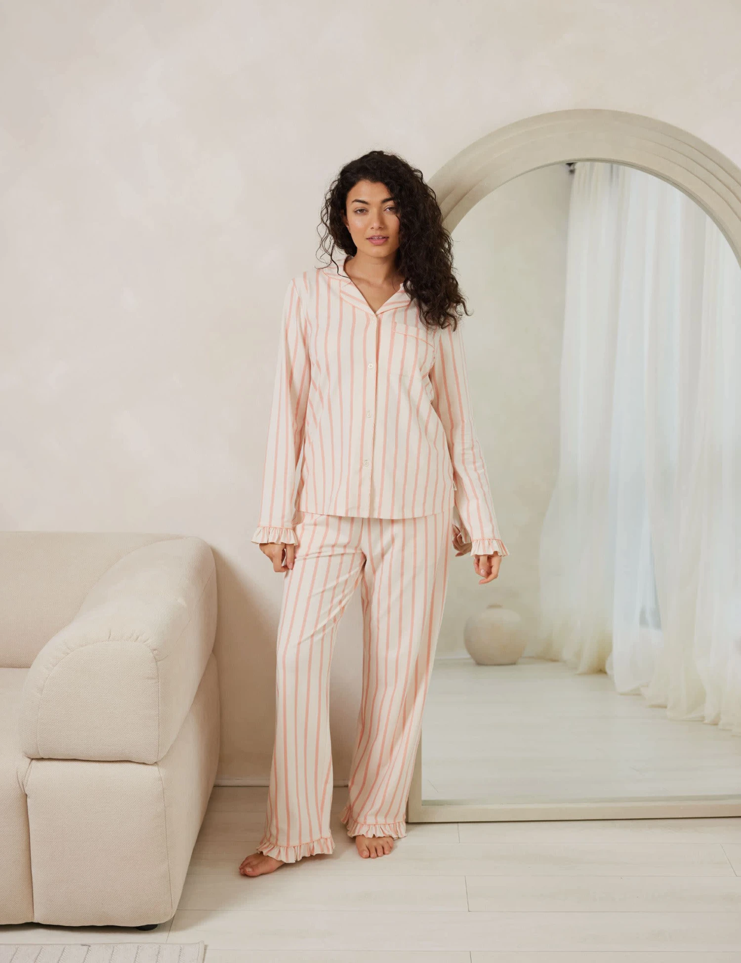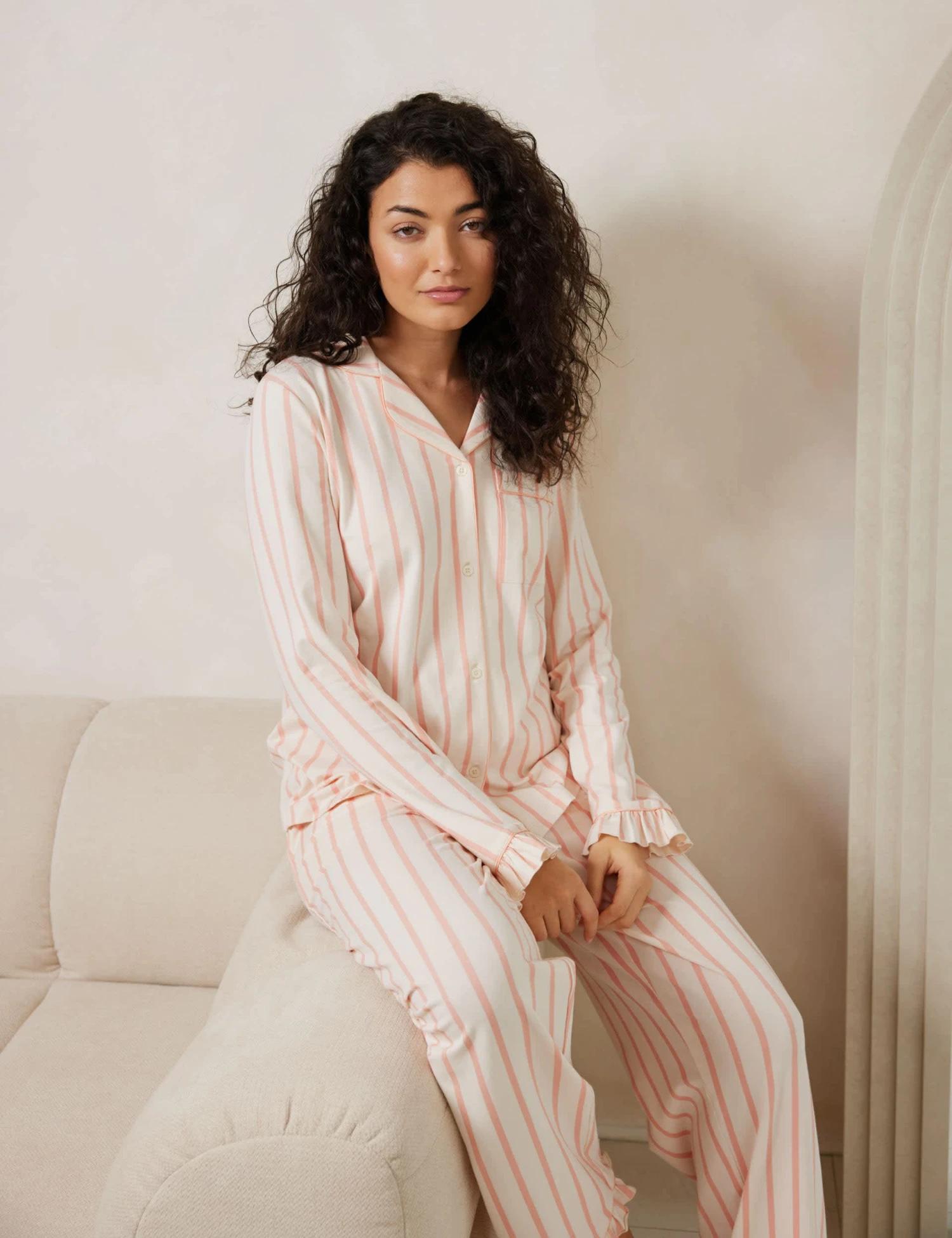 These jersey striped pyjamas by Chelsea Peers bring timeless style to your bedtime routine. The regular-fit set includes a long-sleeved shirt with an open revere collar and a chest patch pocket. The matching bottoms have an elasticated waistband for your best fit, plus handy side pockets and ruffled cuffs.