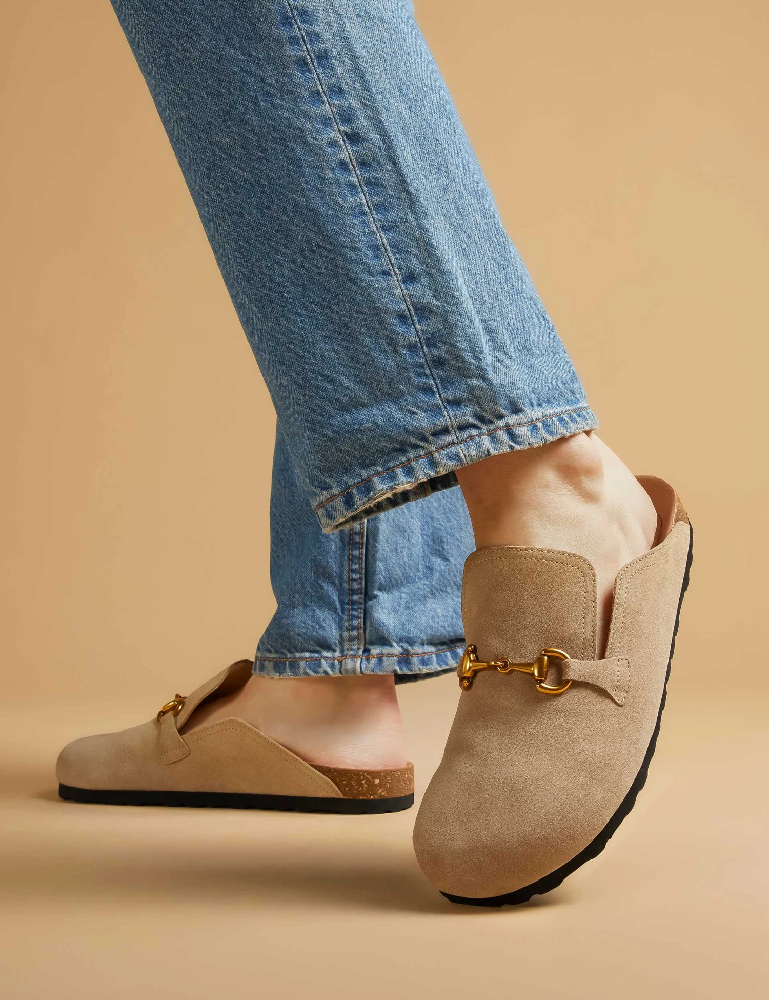 These leather mules from Jones Bootmaker are a versatile choice for summer days. The slip-on style has a flatform sole for easy wear and features geometric grooves on the underside for extra grip. A gold-tone horsebit across the top brings a statement look to the design.