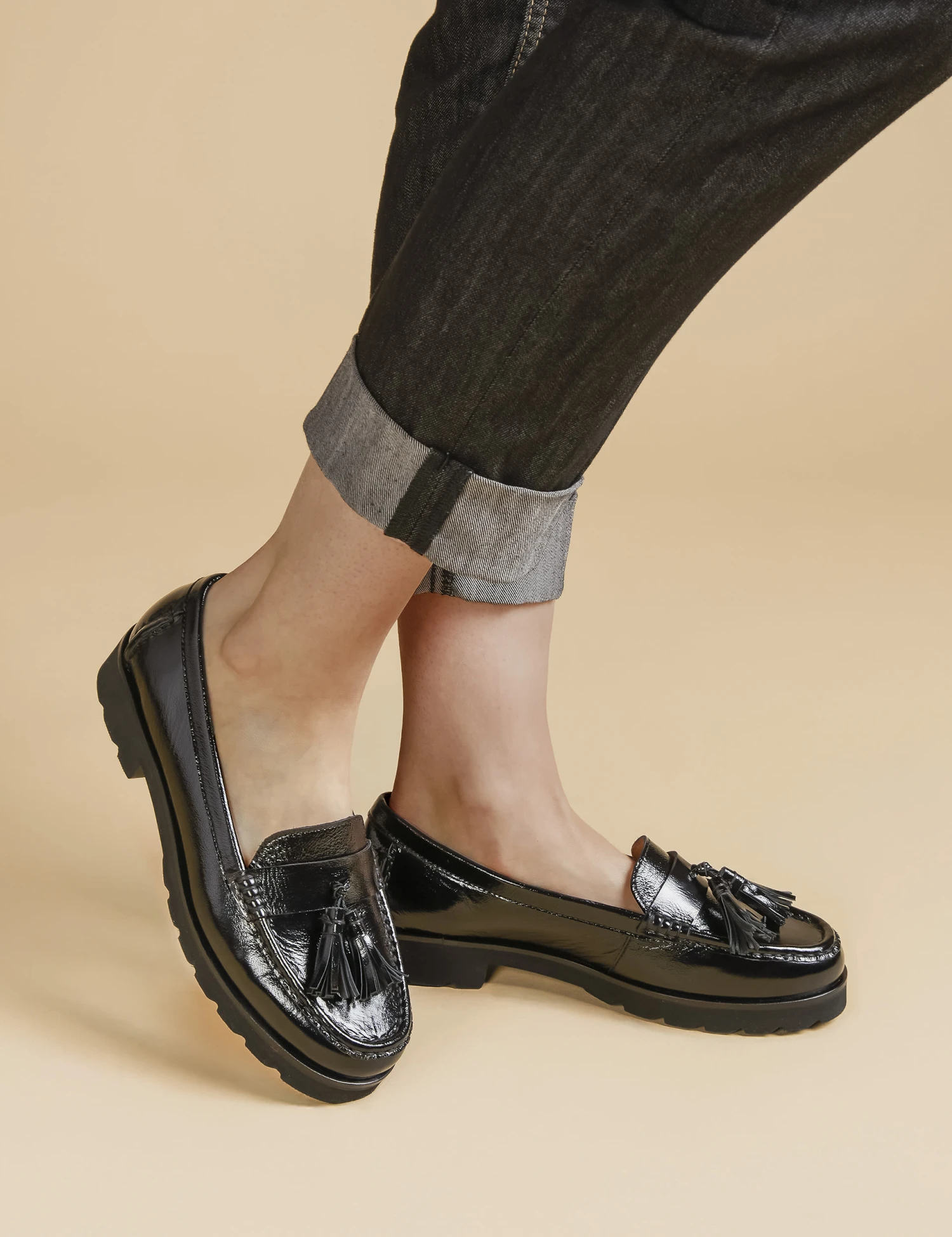 These smart loafers from Jones Bootmaker bring a statement look to your daytime ensembles. They’re crafted from patent leather for a standout effect and are set on a chunky cleated sole. A traditional bar and tassels complete the timeless loafer styling.