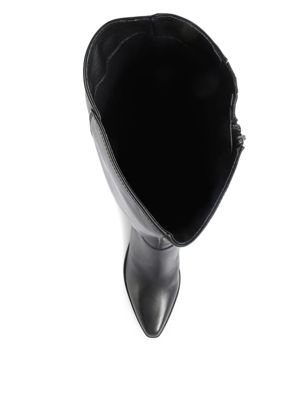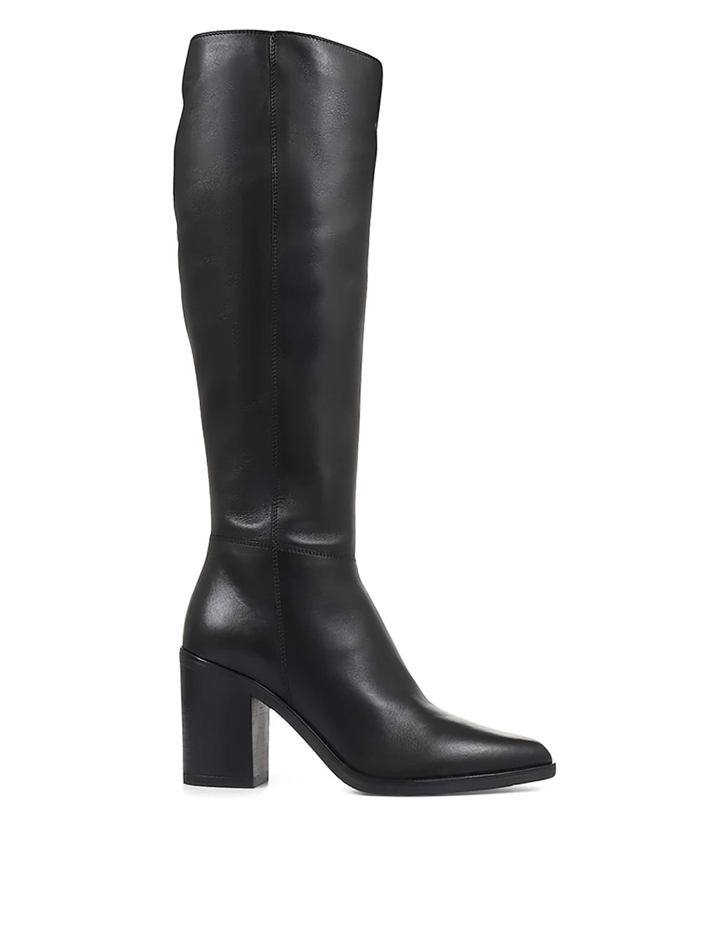 Embrace a sleek footwear silhouette with these leather knee-high boots by Jones Bootmaker. Crafted in a regular fit with a slim calf, these versatile shoes feature a classic pointed toe and a contemporary mid-height block heel. Tonal stitch detailing on the smooth upper adds the finishing touch.