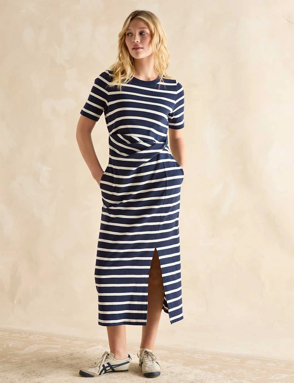 This striped t-shirt dress from Joules is crafted from pure cotton jersey for breathability. Comfy regular fit, with a round neckline and short sleeves. The twist detail creates a flattering waisted silhouette, while a split in the midaxi-length hemline ensures easy movement.
