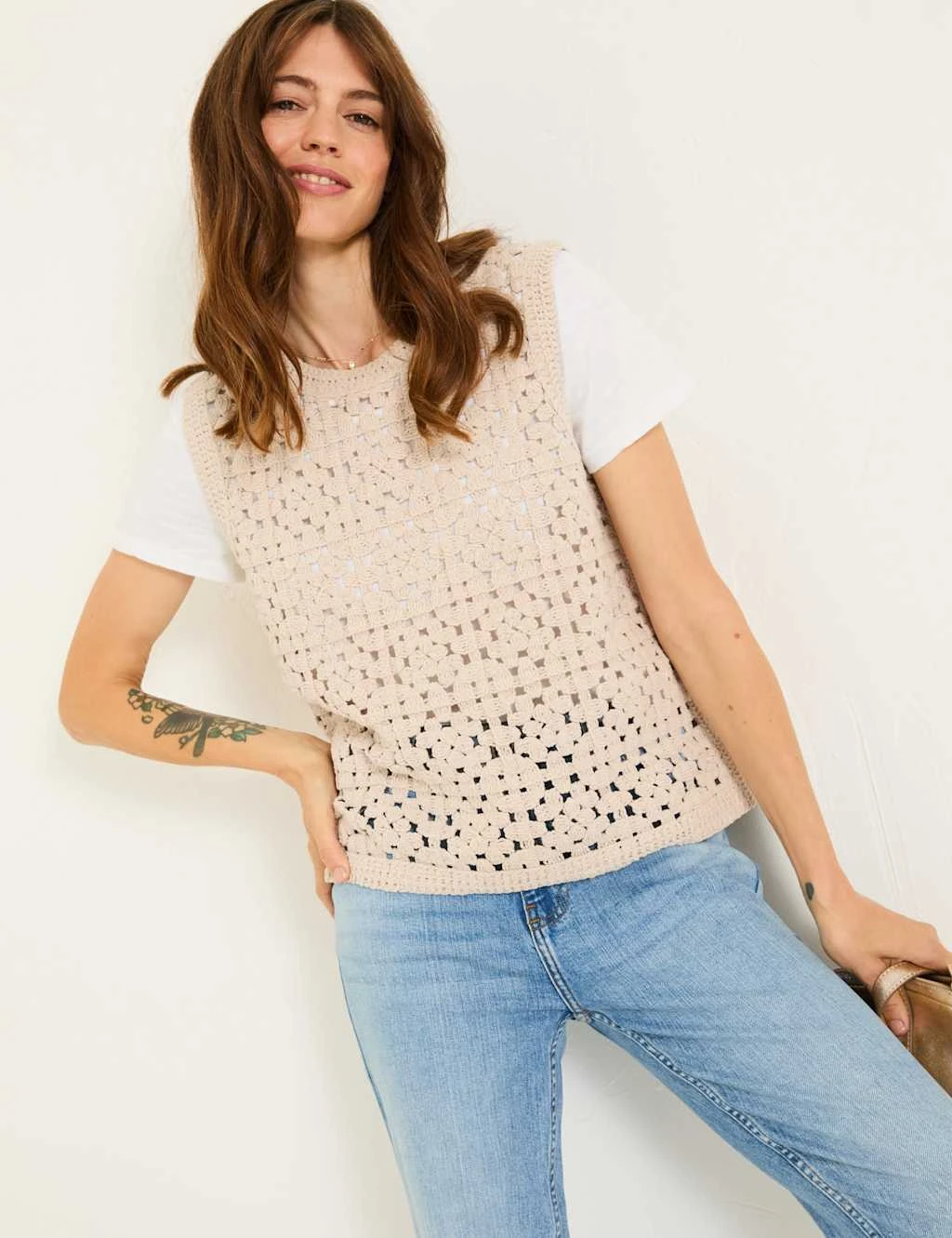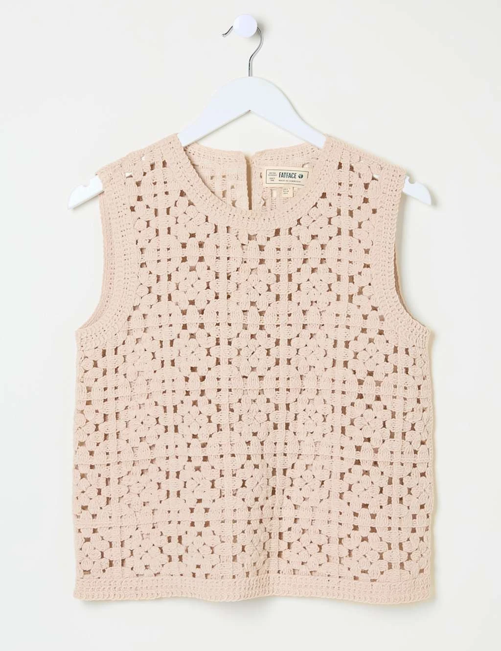 Opt for this textured tank top from FatFace to smarten up your casual outfits. It’s designed in an easy regular fit, with a simple crew neckline and a button fastening at the nape to add a dainty touch. The crochet-style knit creates an eye-catching look, while the open design helps to showcase your favourite layers underneath.