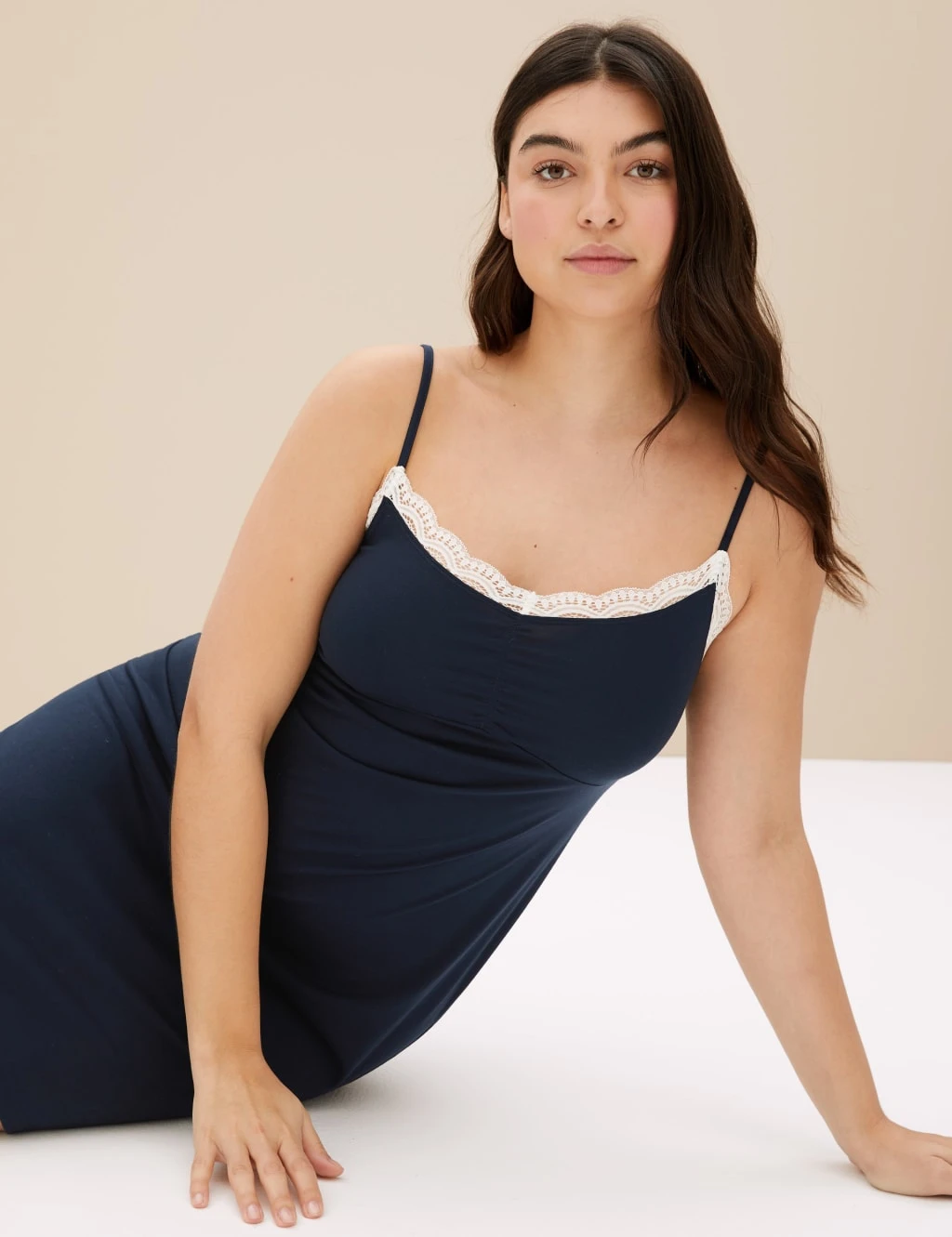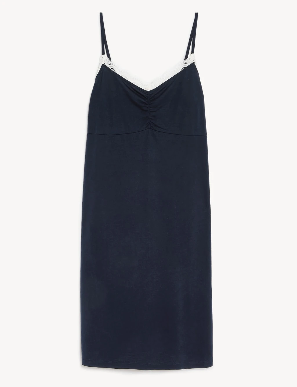 The lace trim adds a feminine touch to this classic strappy chemise. Regular fit, with a short length and a gathered v-neckline. Adjustable straps help you get the perfect fit.