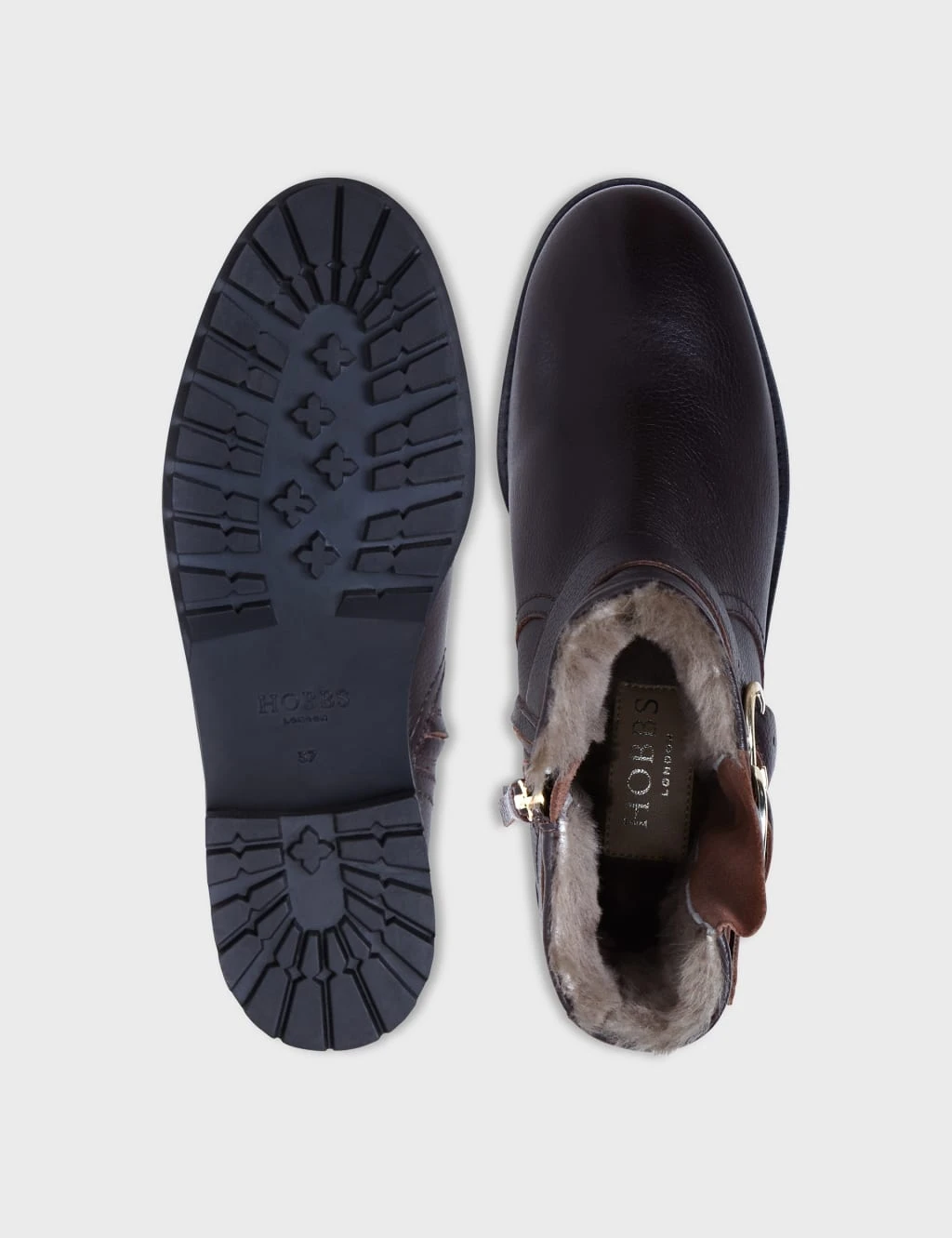 Step into fluffy comfort with these shearling-lined leather boots by Hobbs. They have a versatile ankle height, with handy zips at the sides. Buckle-trim straps and thick cleated soles give them a hardy, biker-inspired look.