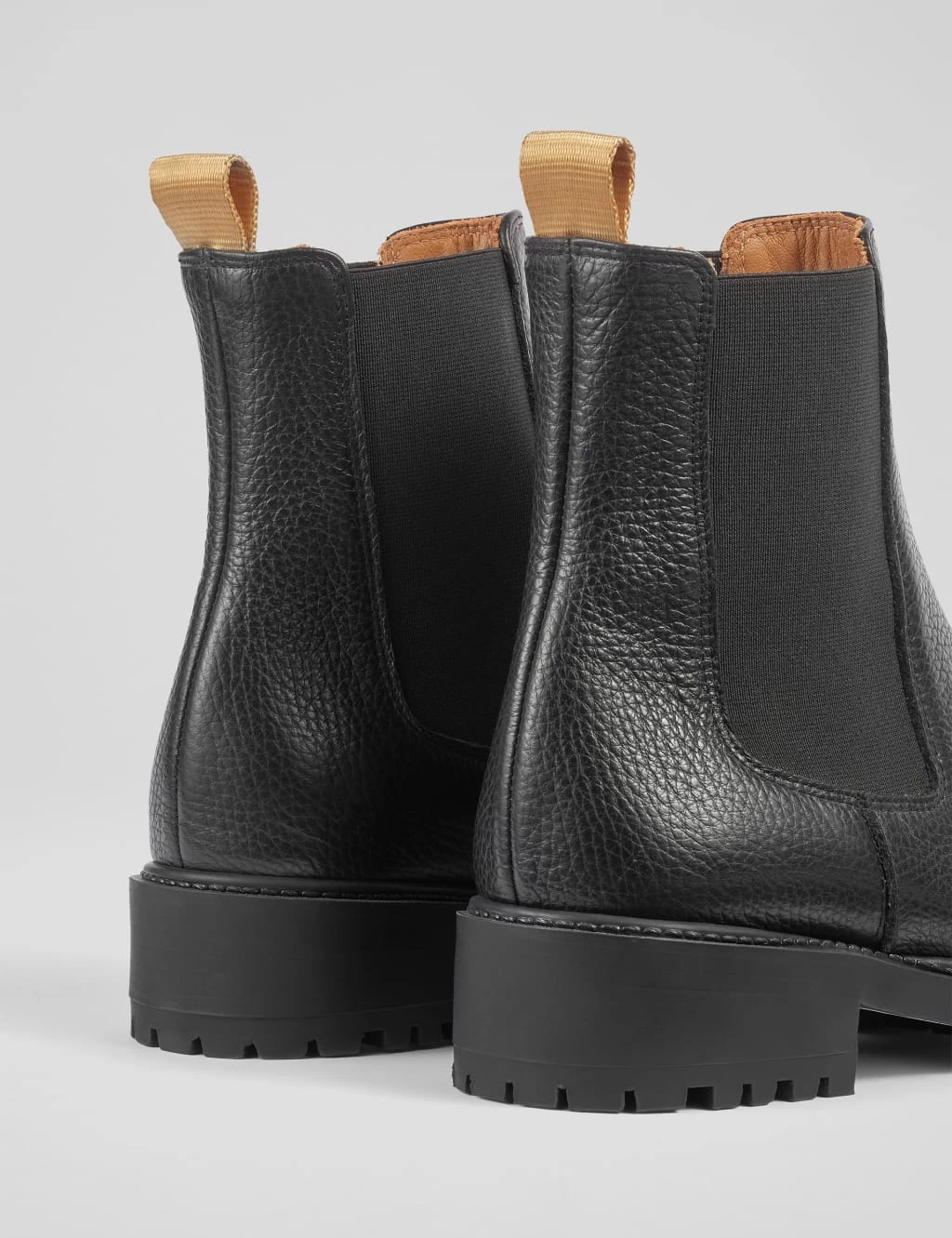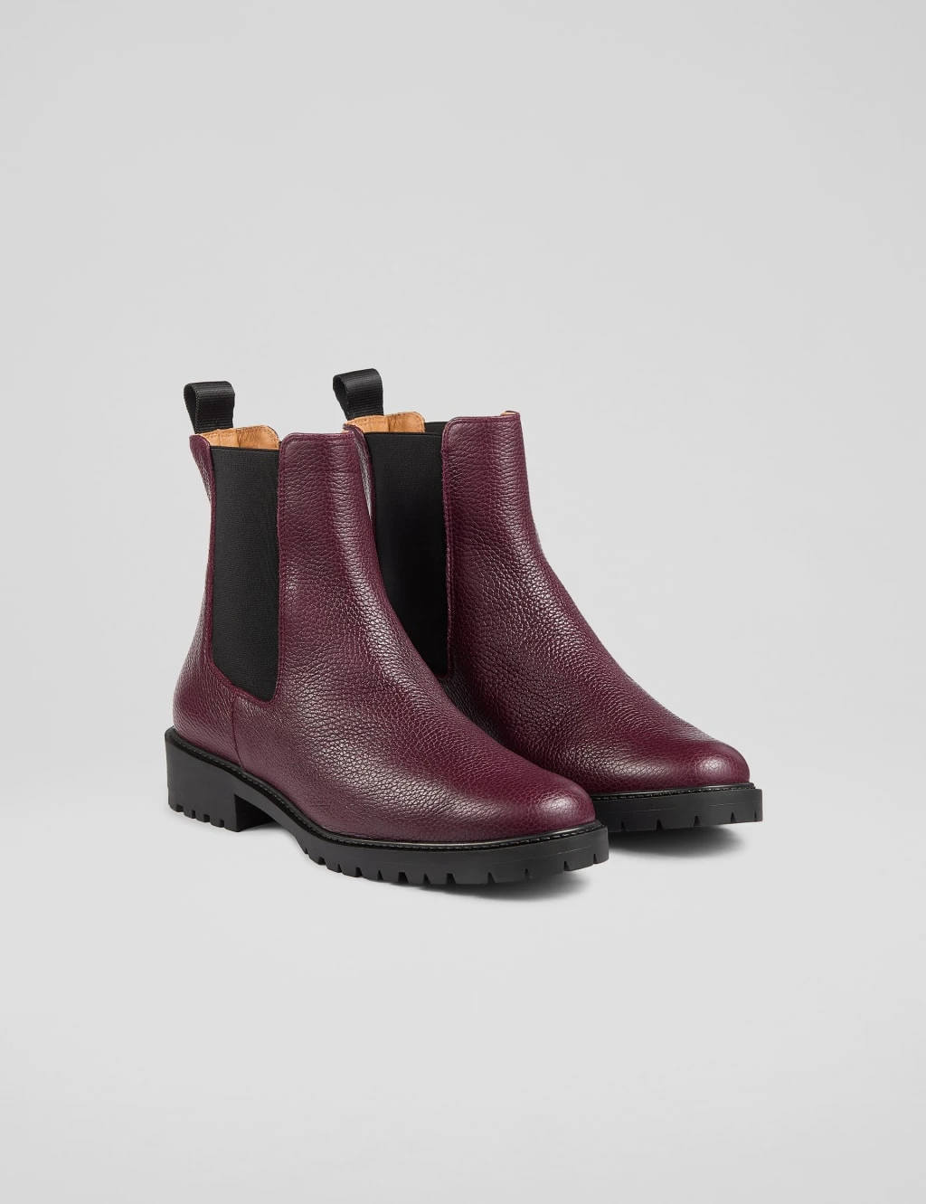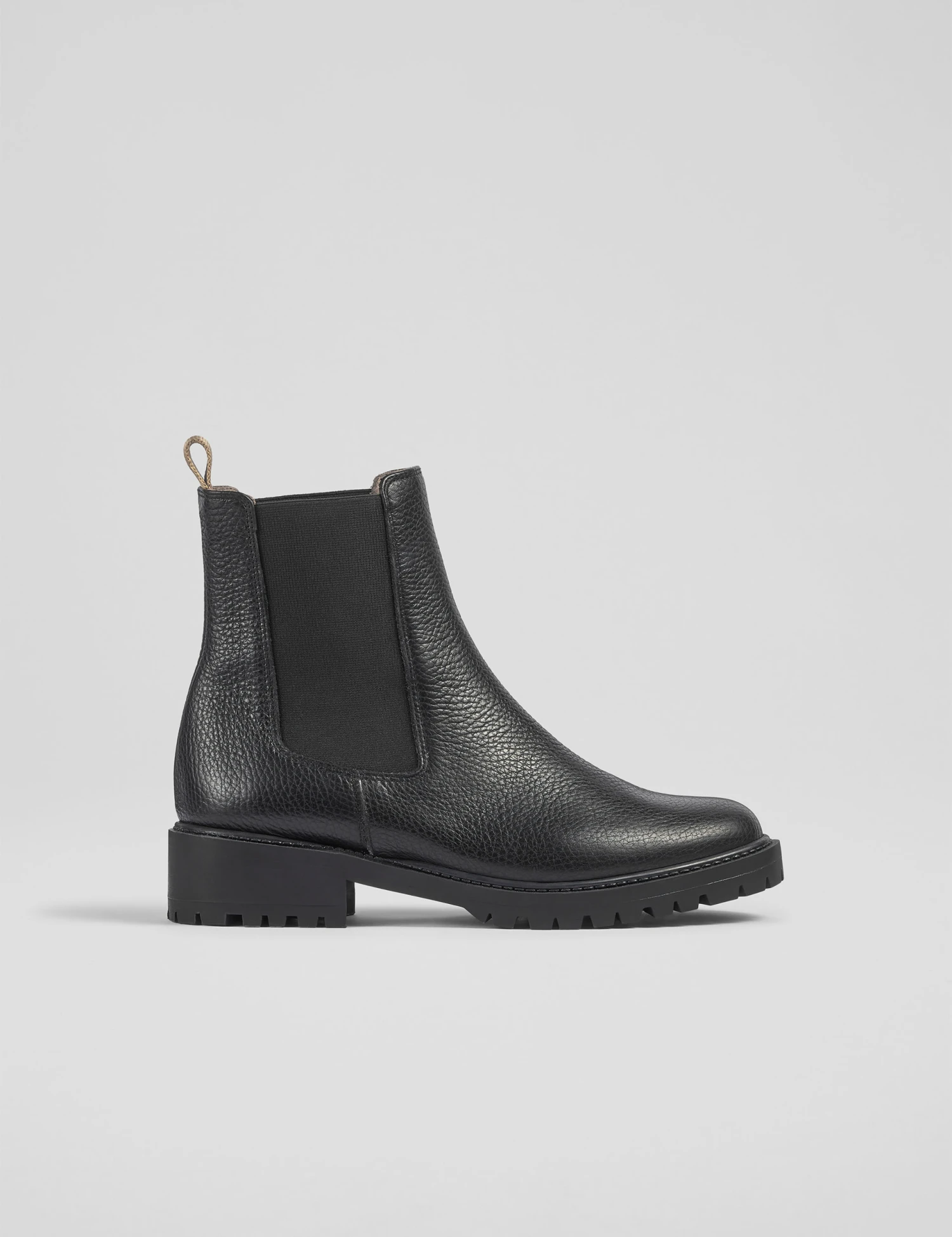Urban chic meets comfort in these Chelsea cleated boots by LK Bennett. They’re crafted from grainy leather for a luxurious look. The treaded low heels and rubber soles offer premium grip on slippery pavements. A contrast pull tab at the back adds a practical touch, while the elasticated side panels ensure a snug fit.