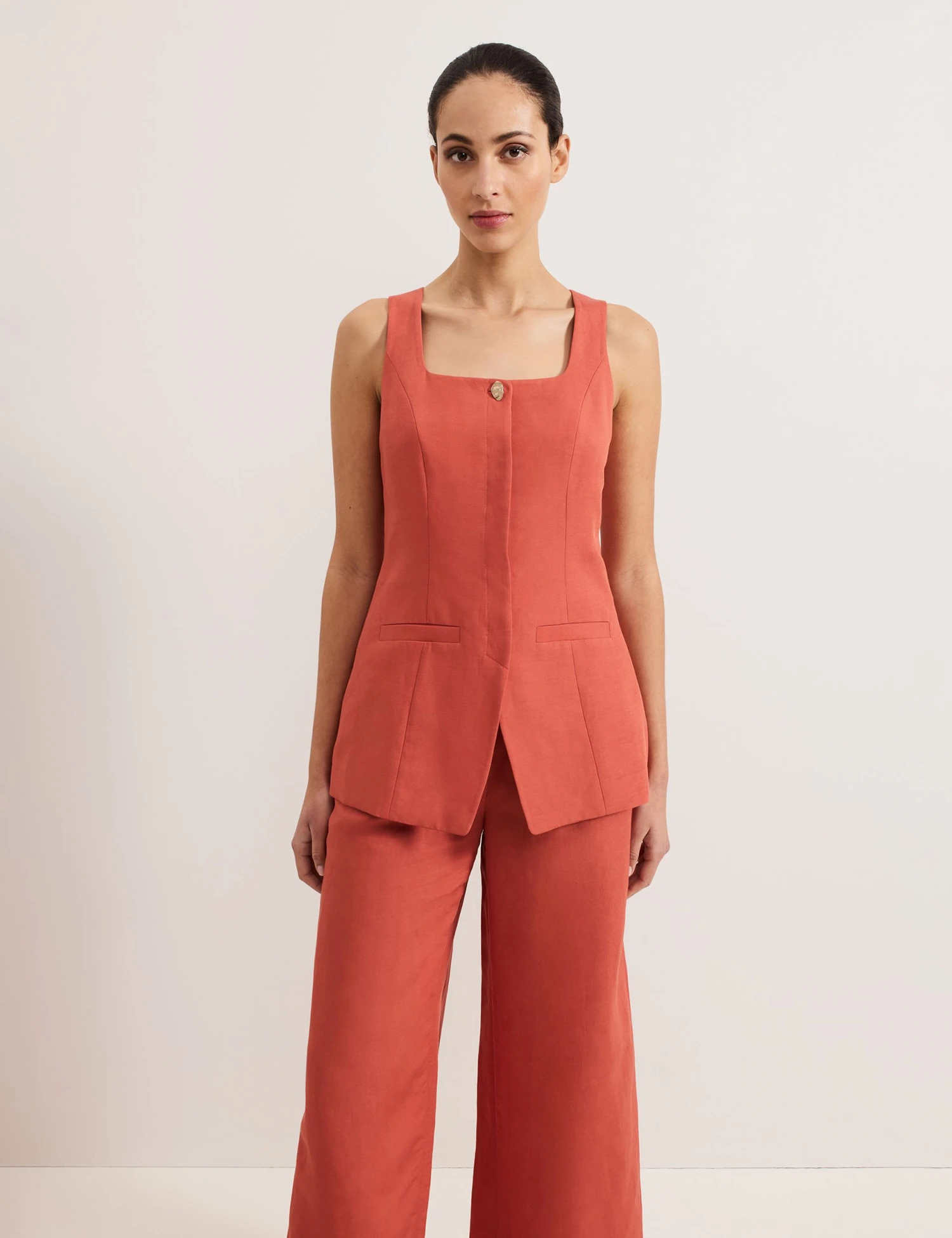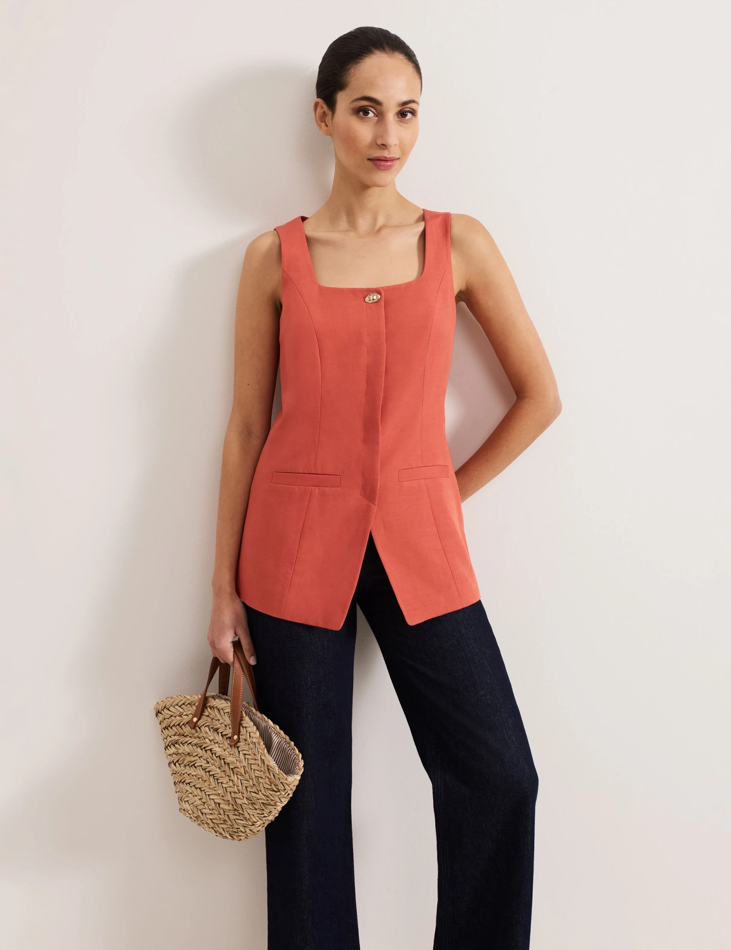 This linen-rich waistcoat by Phase Eight will bring a refined touch to your outfits. It’s made in a regular fit with subtle shaping through the front and a longline silhouette. The square neckline and concealed button placket put a contemporary spin on the traditional design, while front welt pockets add a neat tailored finish.