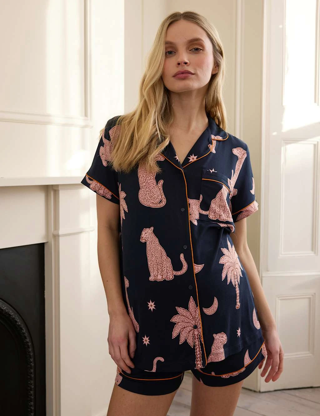 These Chelsea Peers maternity pyjamas are made from cotton-rich fabric with stretch for all-night comfort. The regular fit set includes a short-sleeved shirt with a classic collar, chest pocket and easy popper fastenings. The matching shorts have an elasticated waist that sits comfortably under your bump. A hand-drawn print completes the charming set.