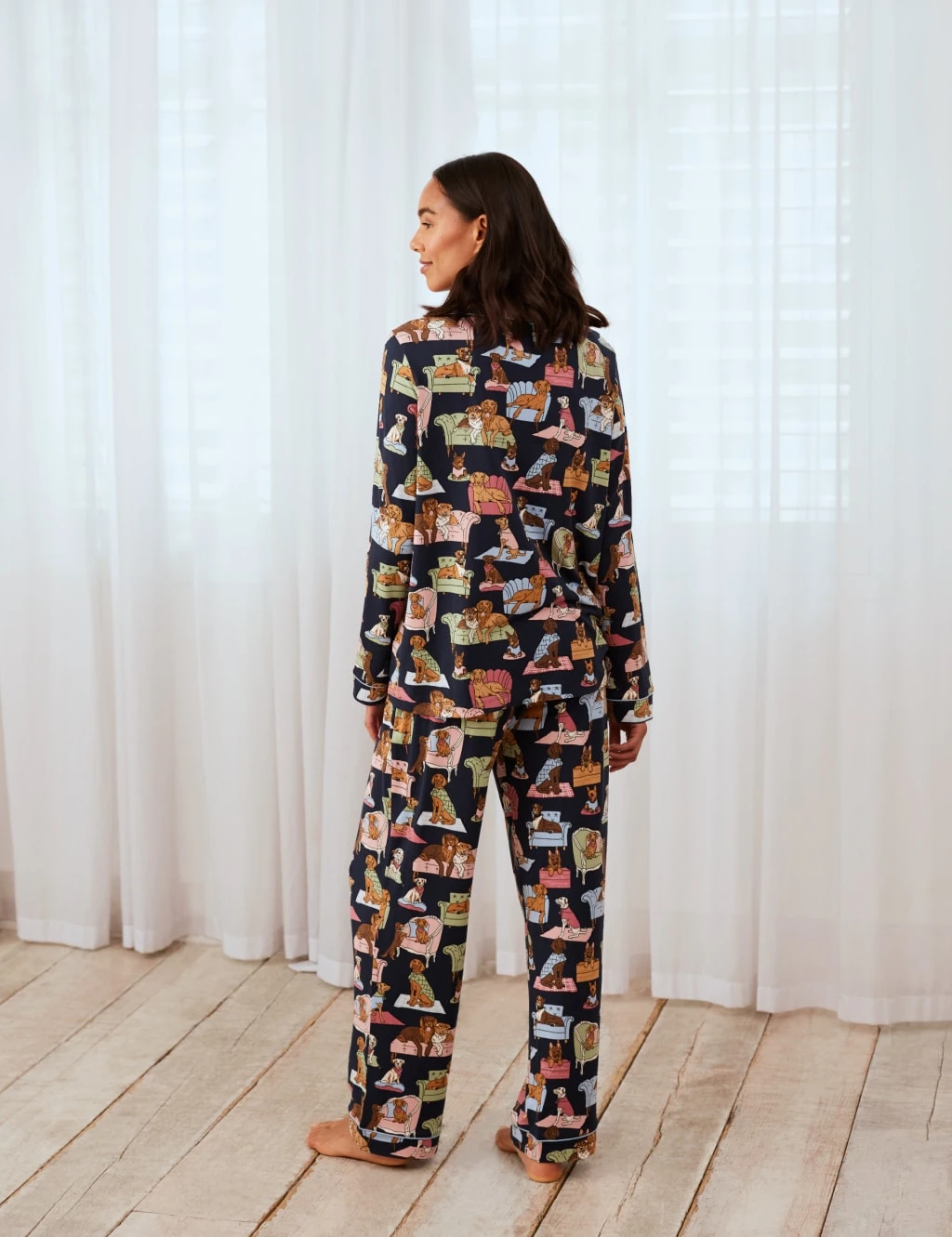 Stay ultra-comfy as you sleep with these soft maternity pyjamas from Chelsea Peers. Designed to flatter your growing bump, the regular-fitting set includes a long-sleeved shirt with a button-through fastening. The matching full-length bottoms feature an elasticated waist for a flexible feel. Both pieces are finished with contrast trims and a fun dog print.