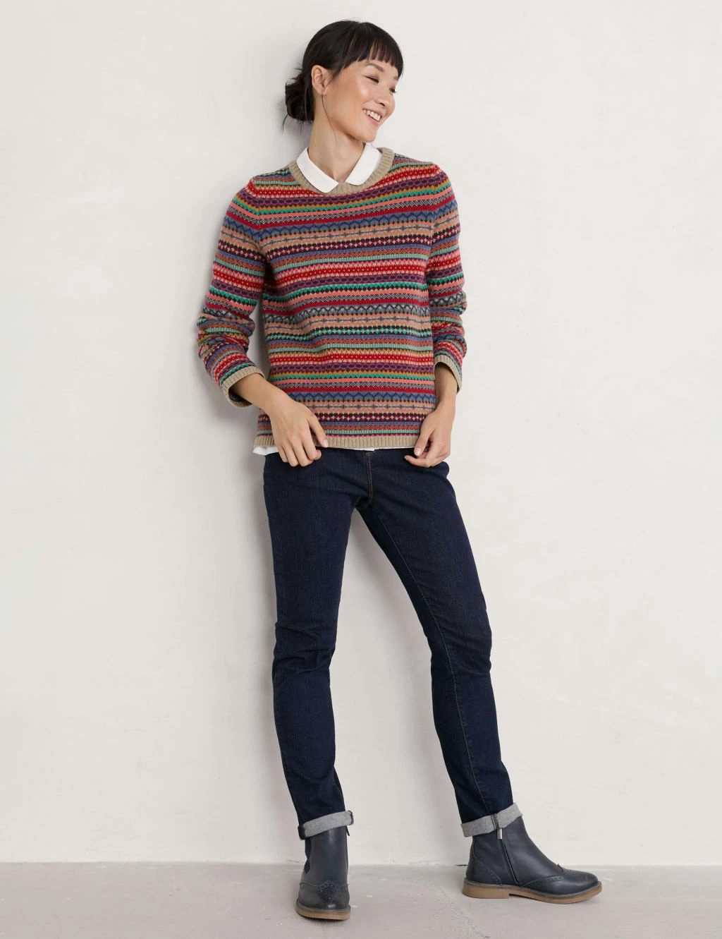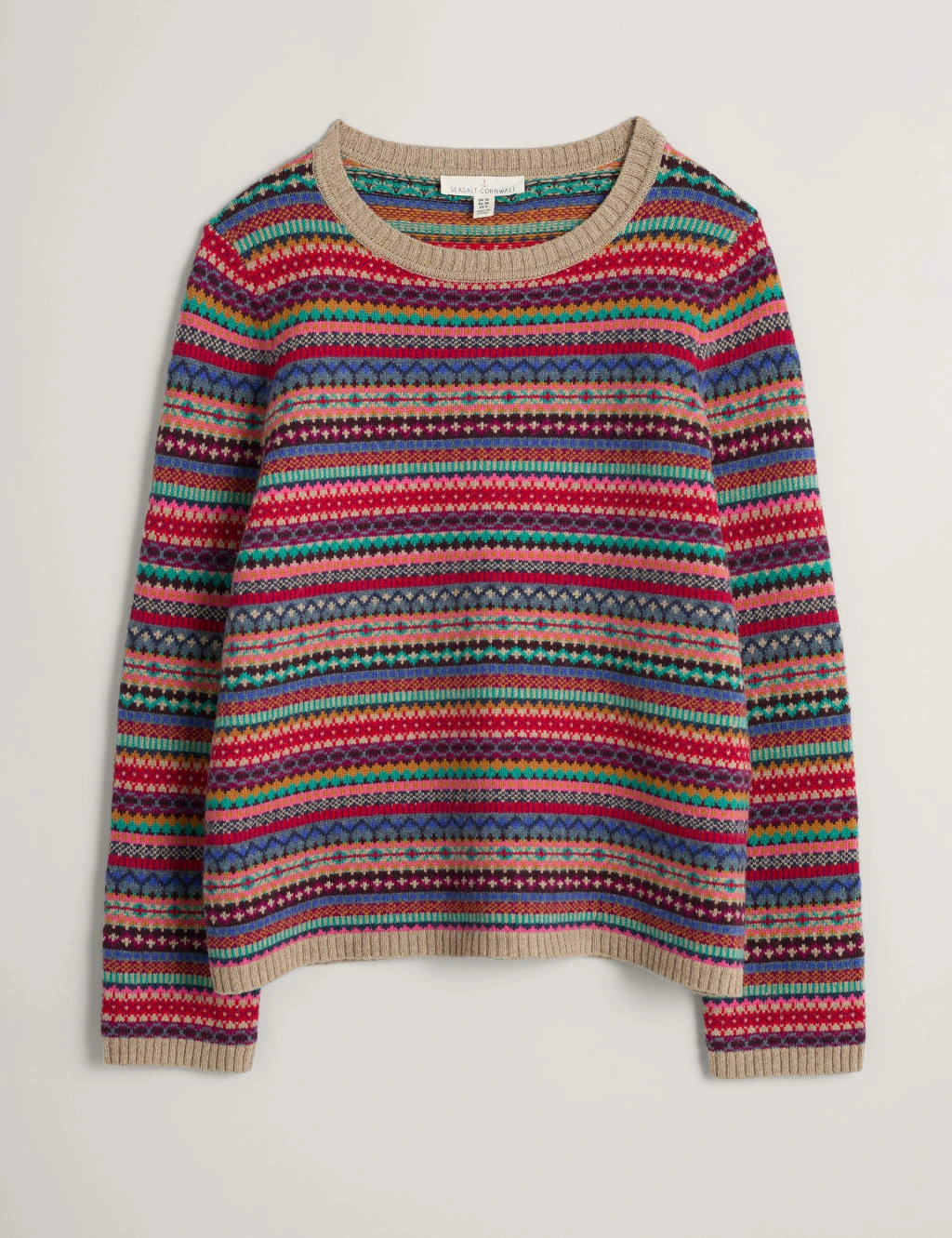 This merino wool-rich jumper by Seasalt Cornwall brings a traditional feel with its eye-catching jacquard knit. It’s designed in a comfortable relaxed fit with warming long sleeves. A crew neck gives it a classic finish, while rib-knit trims on the hem, cuffs and neckline offer a cosy feel.