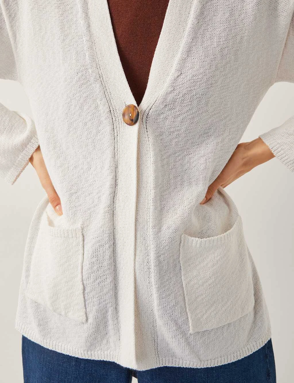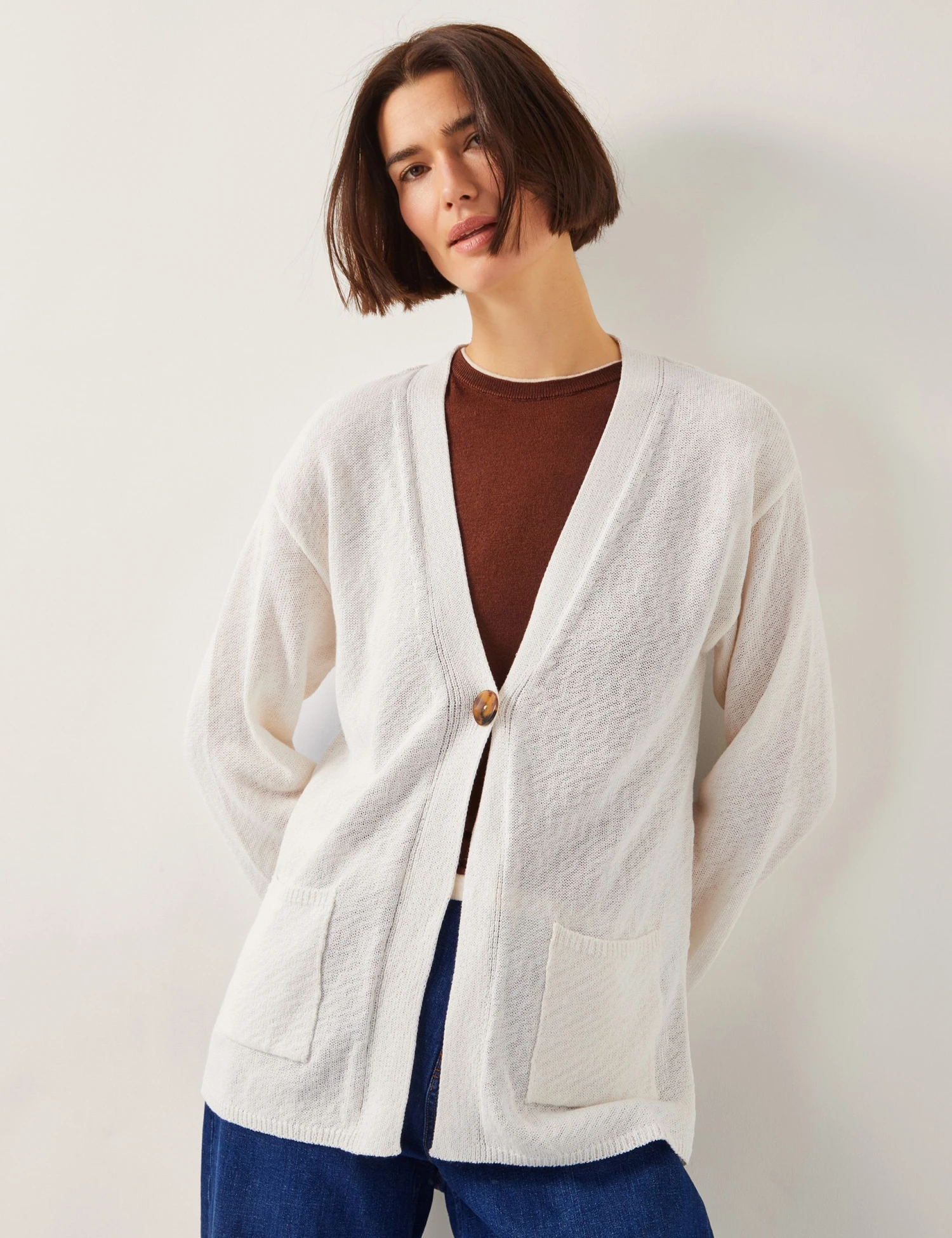 This cotton-rich cardigan from Monsoon makes a versatile cover-up for cooler days. It’s made in a comfy regular fit, with a neat single button fastening on the front. The v-neckline creates a timeless feel, while the textured knit adds extra flair. Two patch pockets provide a handy finish.