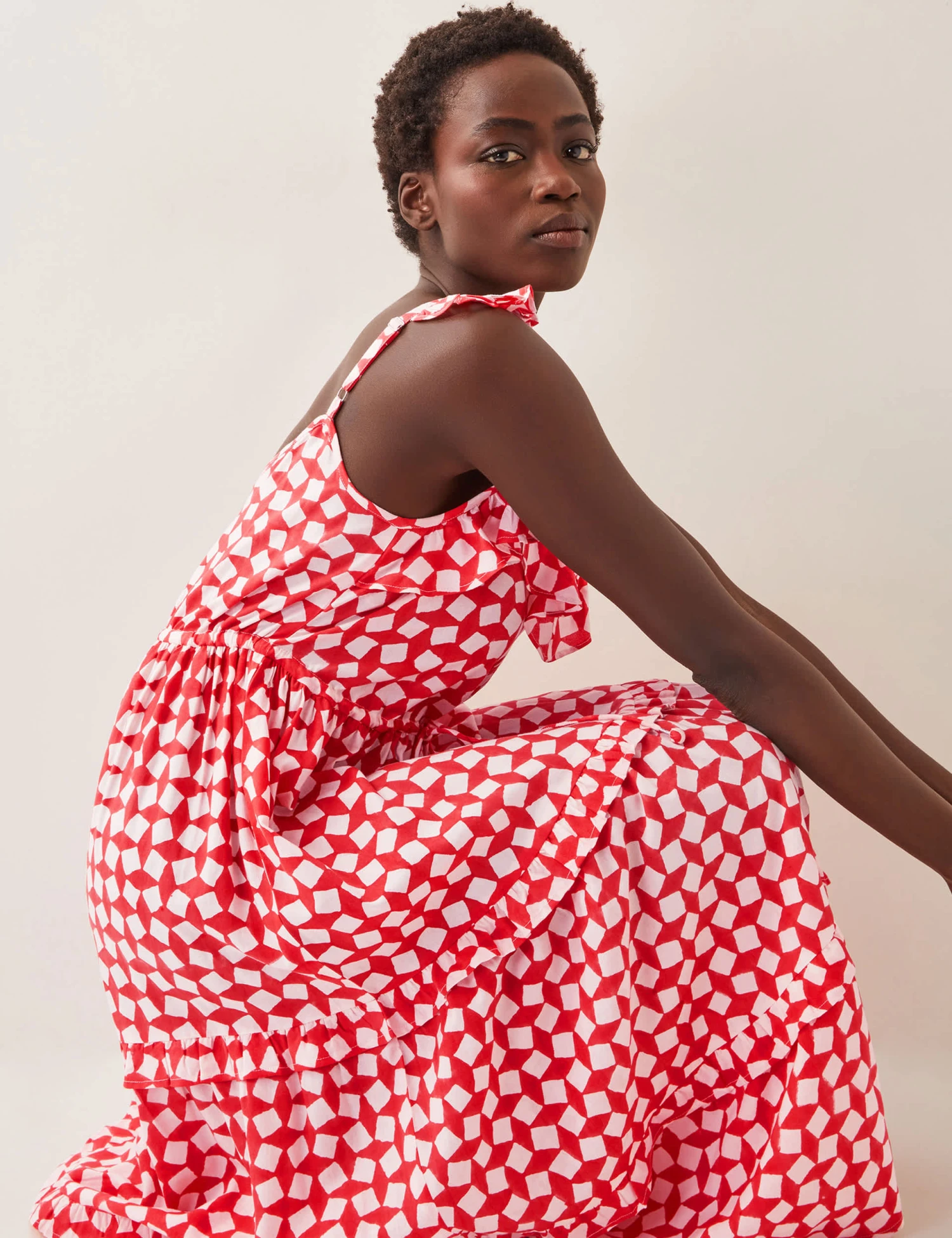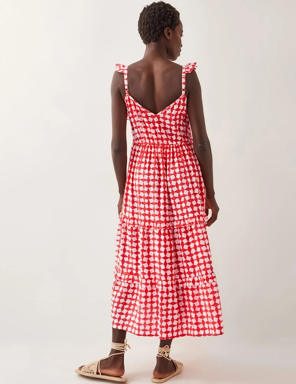 With its bold geometric print, this Monsoon beach dress is a striking choice for your holidays. It’s cut in a regular fit, with a v-neckline and a drawstring at the waist for flattering shaping. The summery style is complete with frill detailing on the tiered midi-length skirt, straps and neckline.
