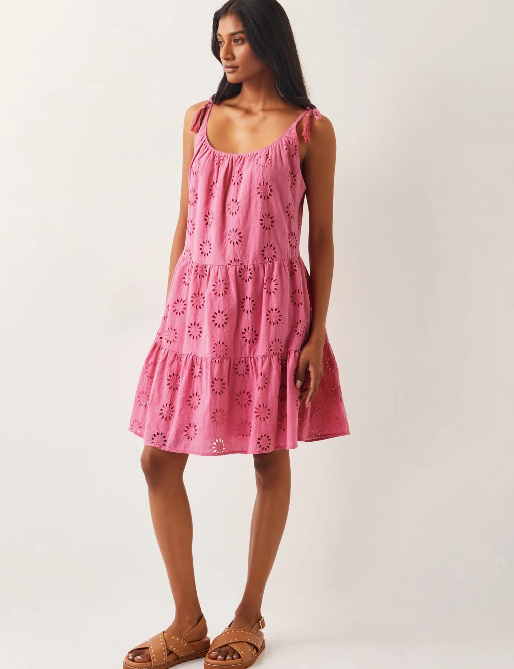 This pure cotton dress from Monsoon is brimming with feminine touches. It’s cut in a regular fit to a breezy skater shape, with tiering on the skirt. All-over broderie detailing provides a romantic feel, while tassels on the shoulder straps add a hint of boho charm. The sleeveless style is complete with a graceful scoop neckline.