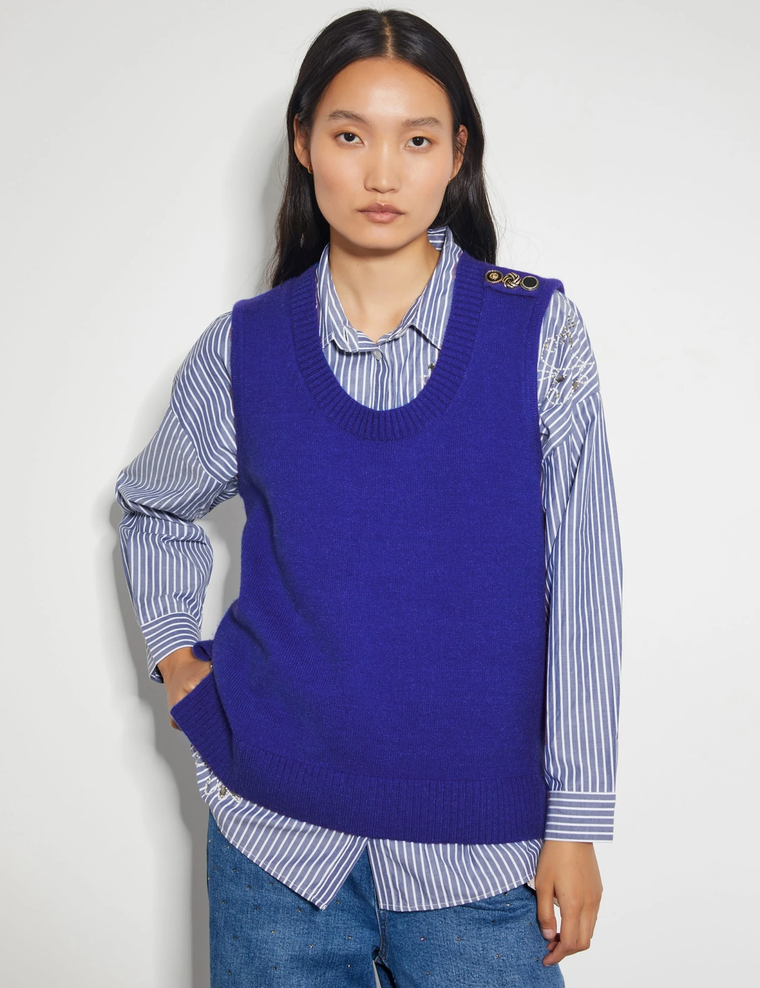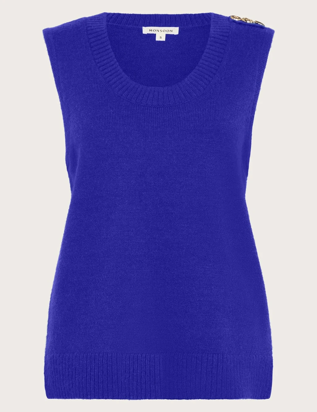 This vibrant knitted vest by Monsoon is the ideal layering piece over casual shirts, blouses and tees. It comes in an easy regular fit with a flattering scoop neck and traditional sleeveless styling. A trio of embellished buttons in different designs adorn the shoulder for a touch of conversation-starting detail.