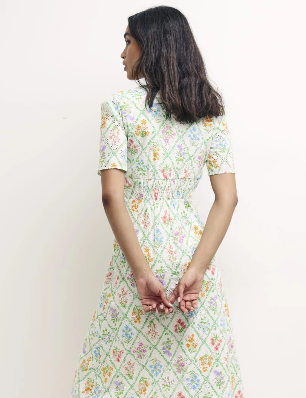 Broderie detailing and vintage-inspired florals combine to create this organic cotton tea dress by Nobody’s Child. It’s fitted through the body, with elasticated shirring at the back for comfort and a flattering silhouette. The deep split at the midi hem adds flowy movement, while a v-neckline, short sleeves and covered buttons through the front complete the classic look.