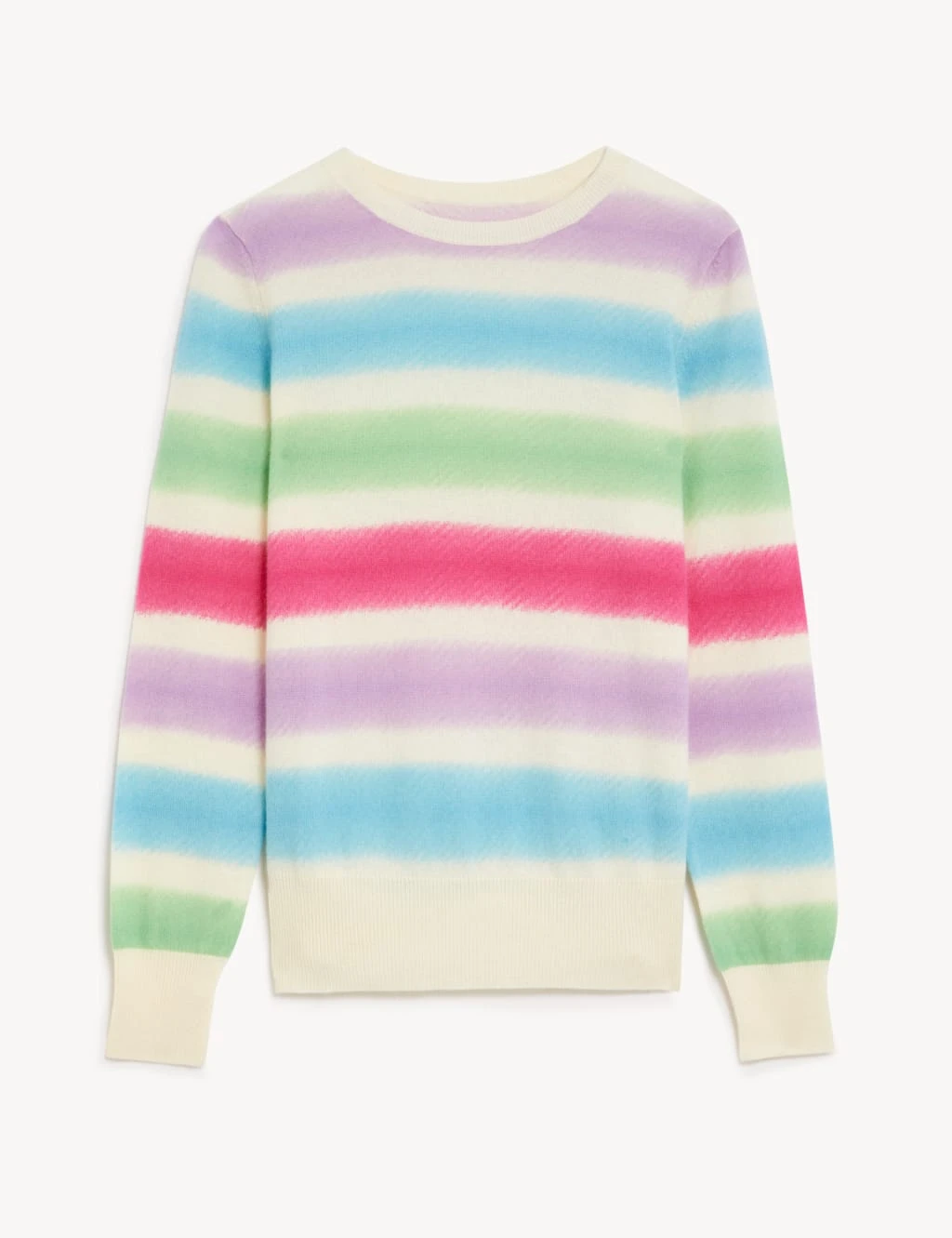 Pull on this pure cashmere jumper for soft-as-clouds comfort and cosy warmth. It’s made in a comfy regular fit, with an easy crew neckline. Ombré stripes provide a delicate rainbow of colours, while ribbed trims at the cuffs and waistband complete the look.
