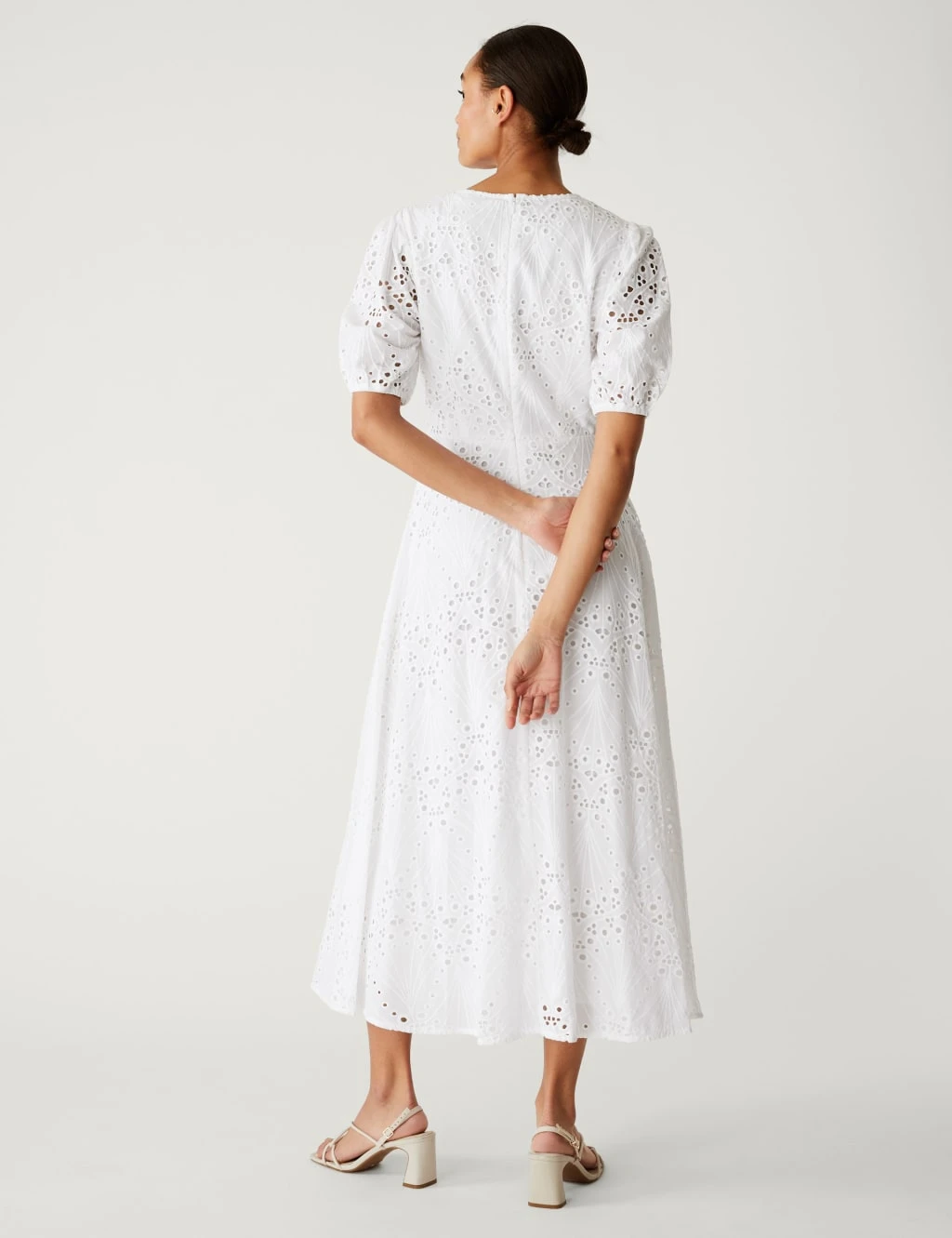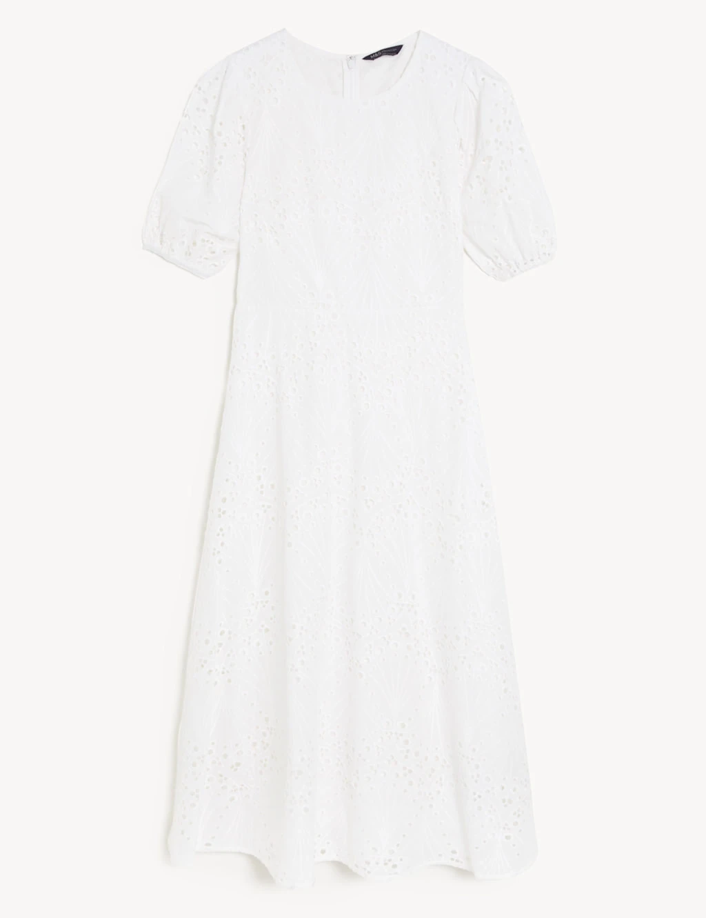 A breezy piece for summer, this tea dress is crafted from pure cotton with a charming broderie anglaise overlay. It’s cut to an effortless regular fit, with a simple round neckline and back zip fastening. Elasticated cuffs on the unlined, short sleeves create a touch of volume for a romantic silhouette, complemented by the midaxi length skirt.