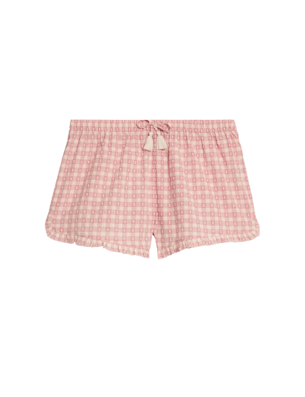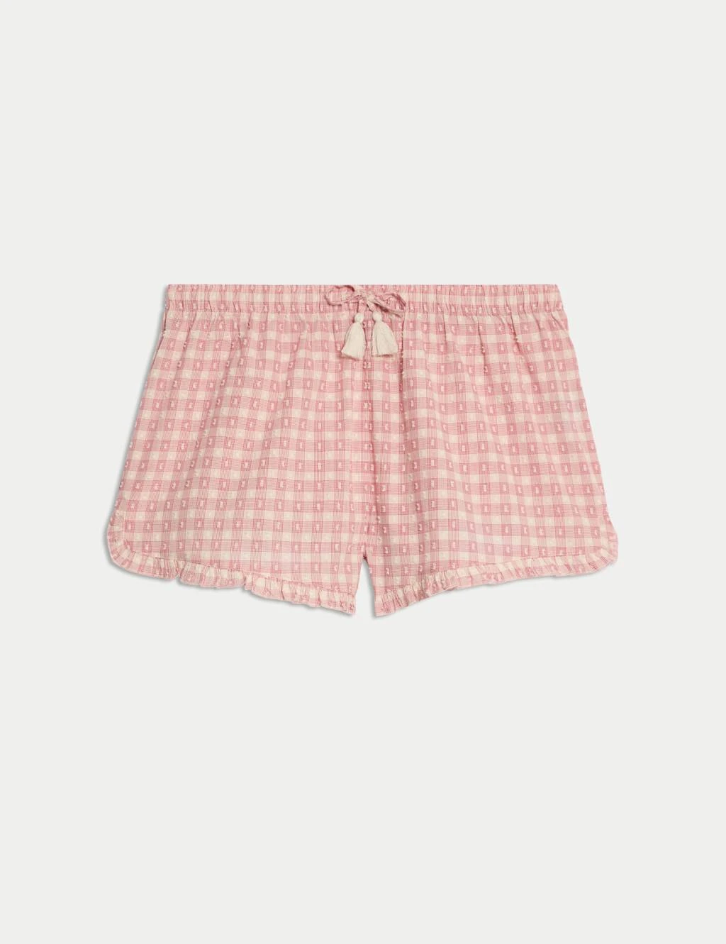 These pure cotton pyjama shorts are a comfy choice for warmer nights. Regular fit. Crafted from textured dobby fabric with an all-over gingham check. Finished with frilled hems and a tasselled drawstring waist. M&S Collection: versatile styles in modern shapes with unique and playful details.
