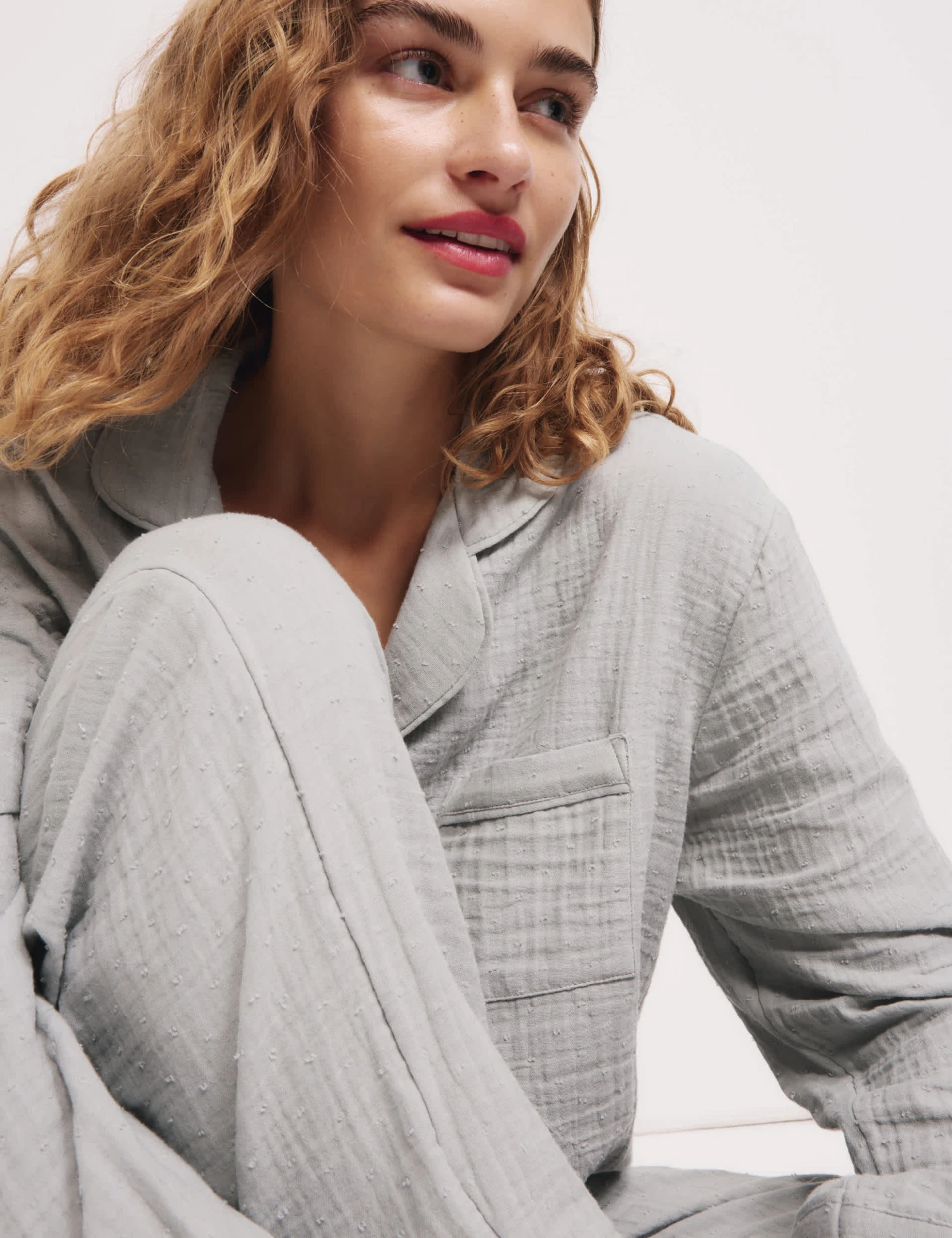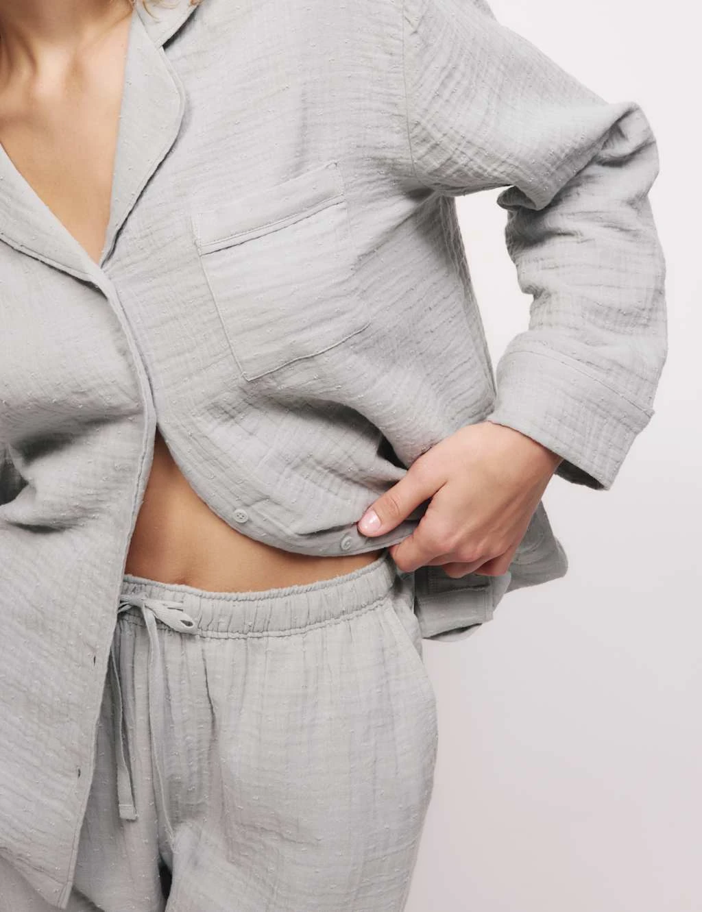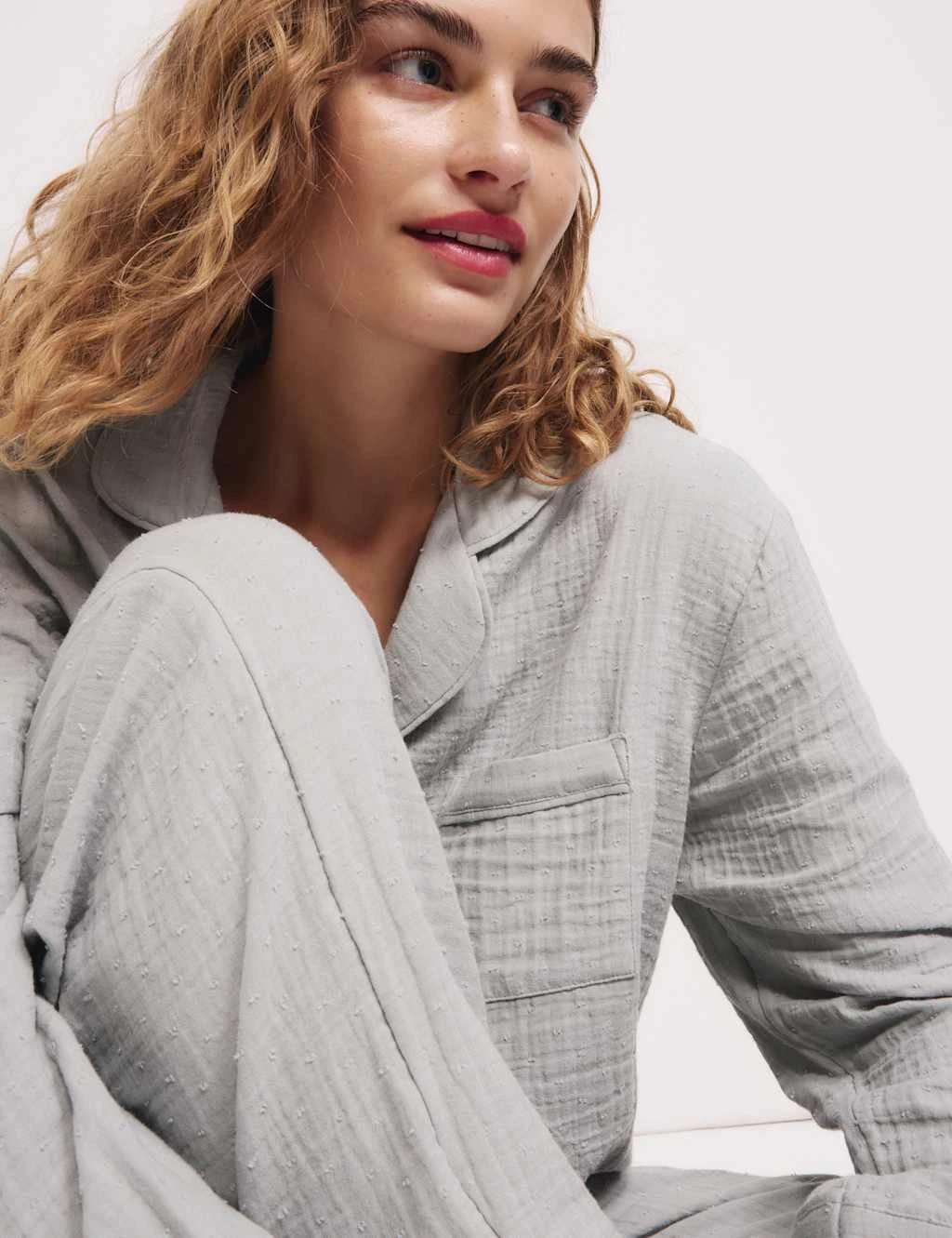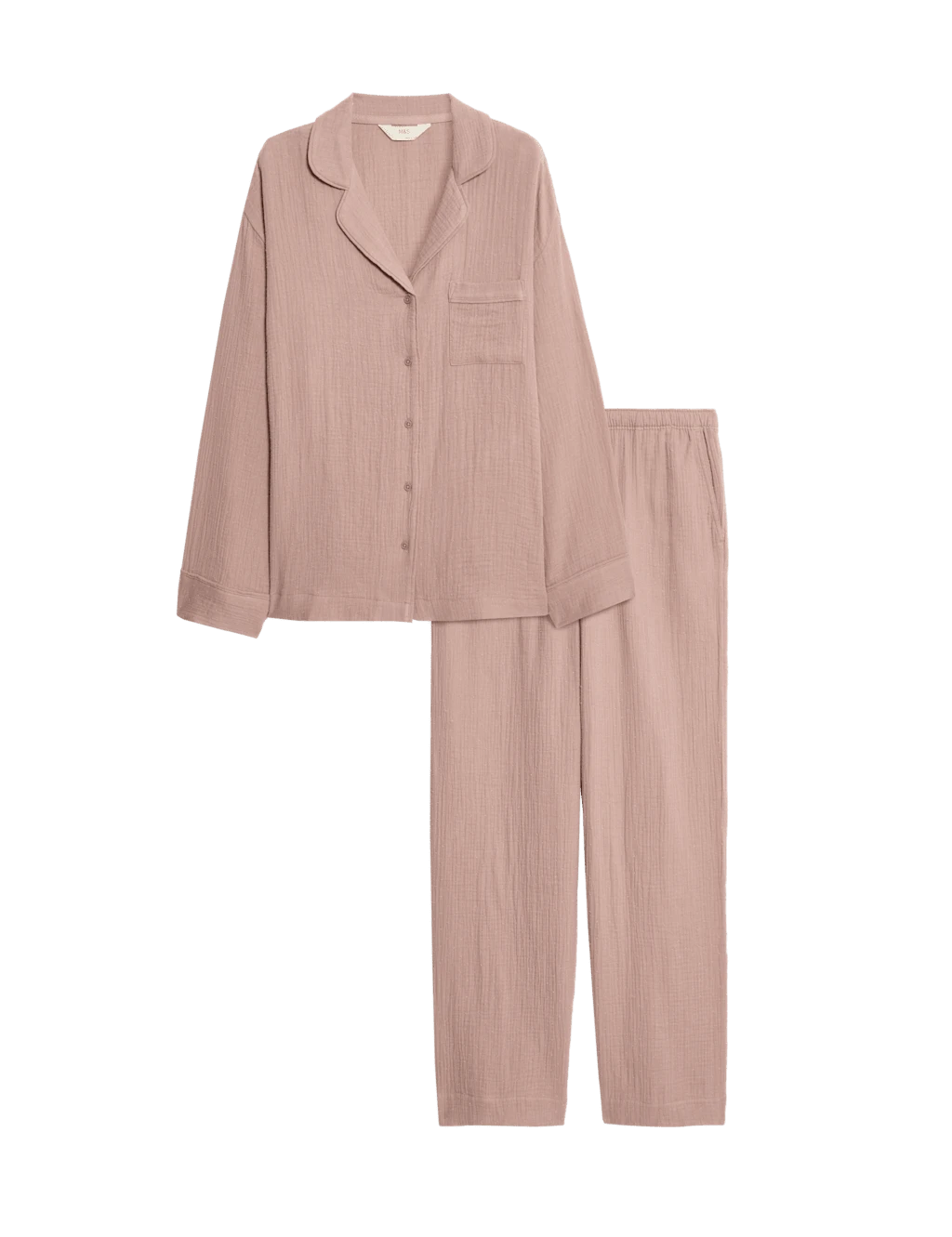 Drift off to dreamland in the breathable comfort of this pure cotton muslin pyjama set. Easy regular fit, comprising a button-up top and long bottoms with an elasticated waist. An open revere collar ensures a relaxed feel. M&S Collection: versatile styles in modern shapes with unique and playful details.