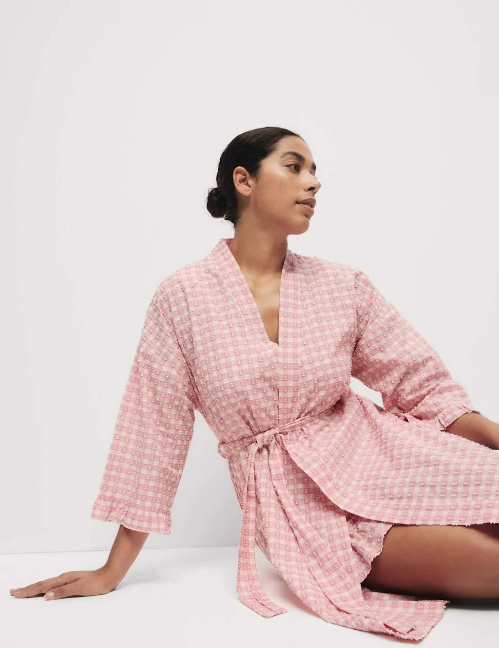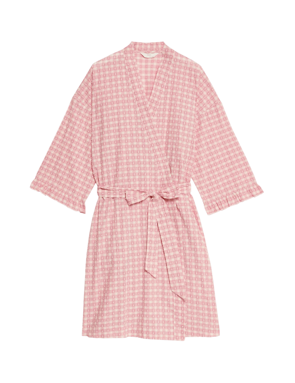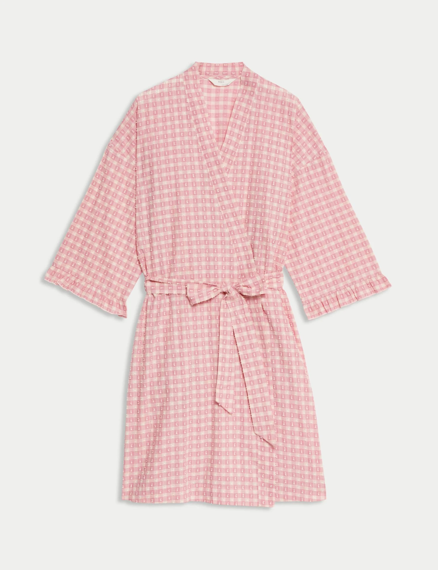 Crafted from pure cotton fabric, this wrap provides a light extra layer for warmer days. Comfy regular fit, with a long hemline for good coverage and an adjustable self-tie belt. Its yarn-dyed gingham check is complemented by an all-over dobby texture. Frill trims at the cuffs add playful detail. M&S Collection: versatile styles in modern shapes with unique and playful details.